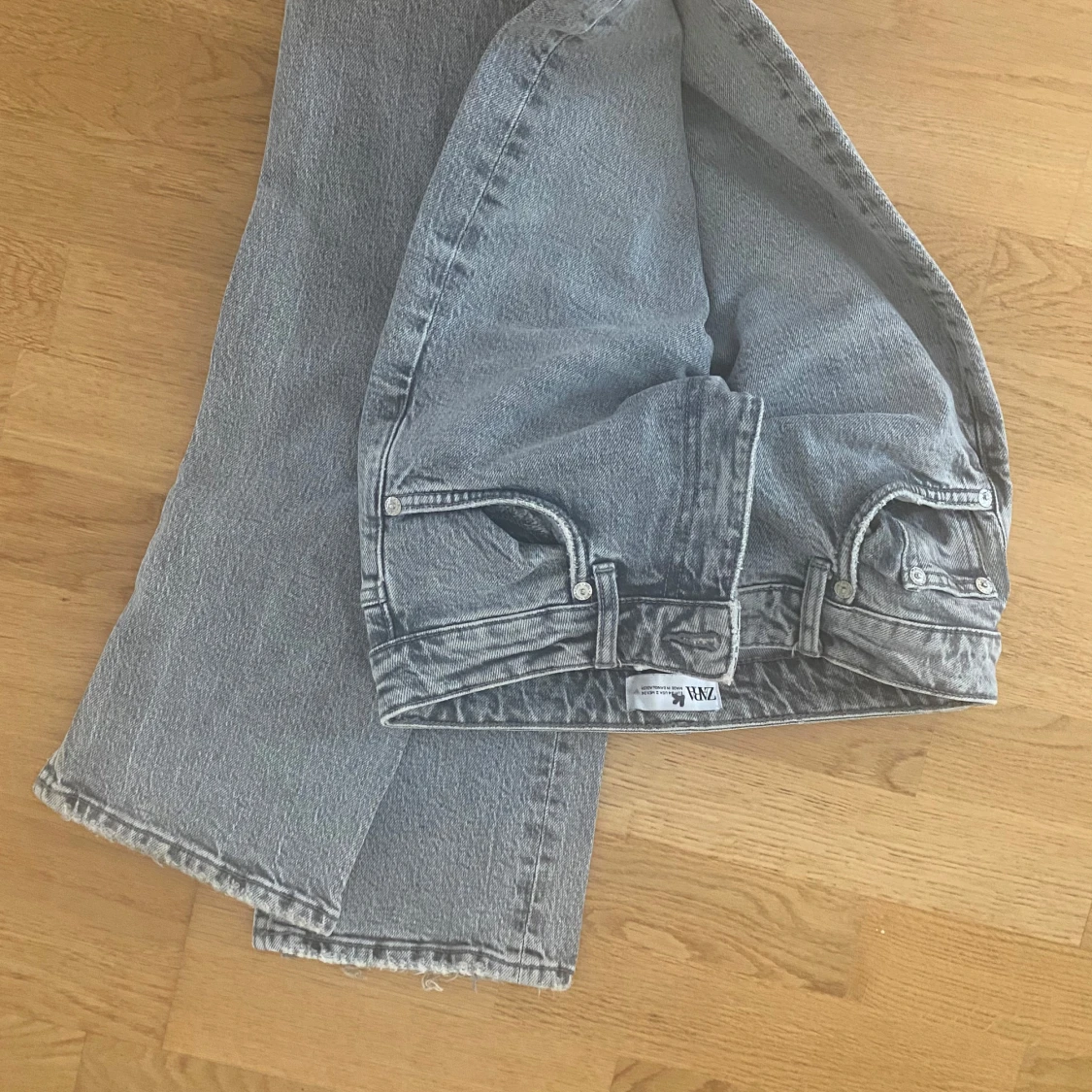 Säljer ett par gråa jeans från Zara med breda ben och klassiska femficksdetaljer. Jeansen har en ljusgrå tvätt och raka, lite fransiga benslut för en chill vibe. Perfekt för dig som gillar loose fit och vill ha en cool streetstil.