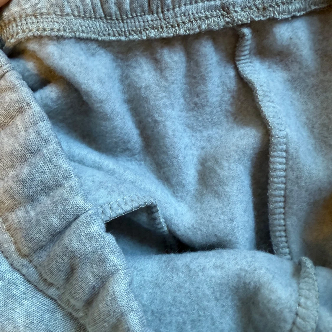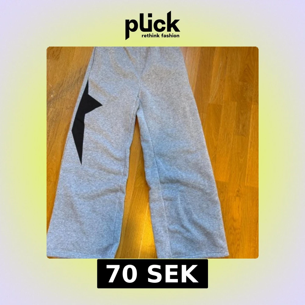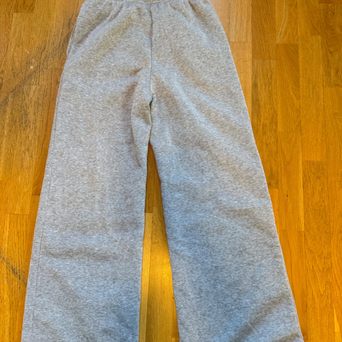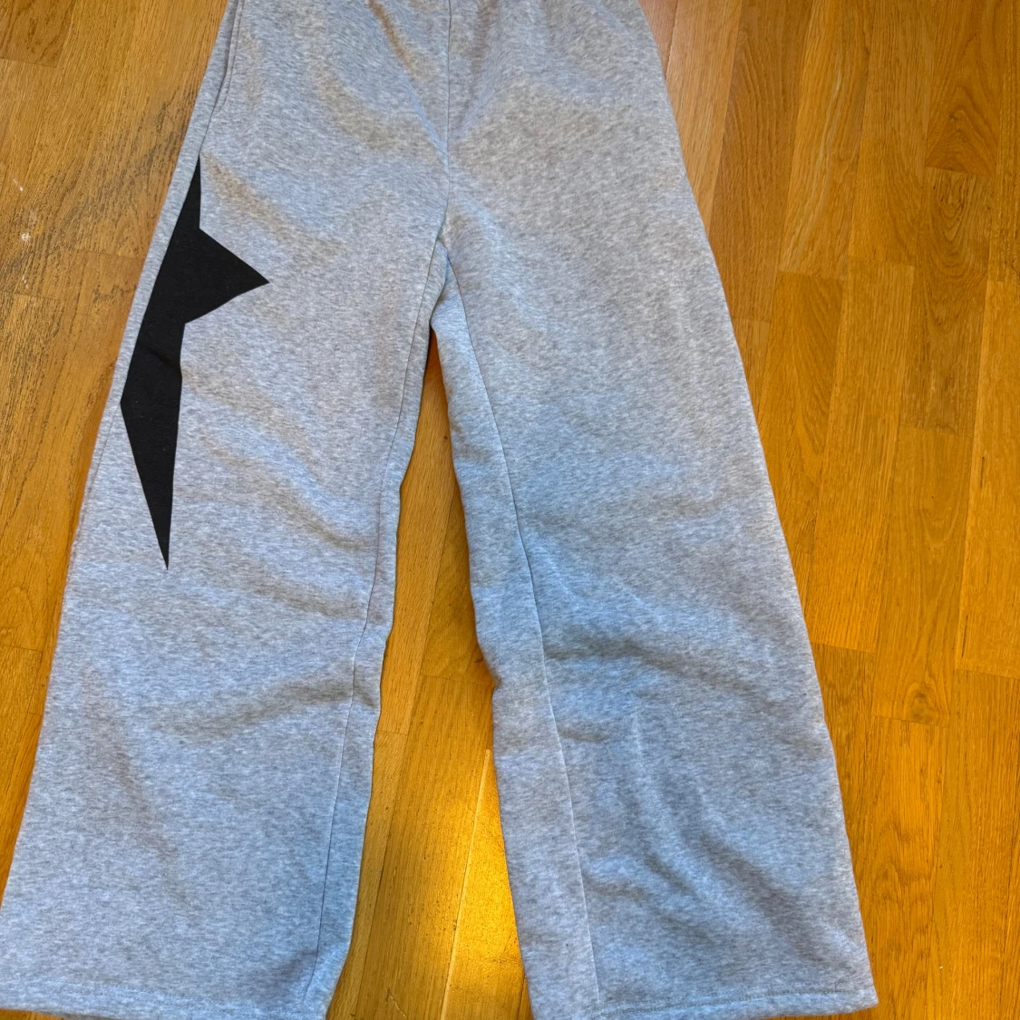 Säljer ett par grå mjukisbyxor med bred passform och elastisk midja. Ena benet har en svart grafisk detalj som ger en cool touch. Byxorna är gjorda i mjukt och fleeceliknande material på insidan, perfekta för chill dagar. Hittar tyvärr ingen lapp så har ingen koll på storlek men skulle säga S/M! De har endast testats