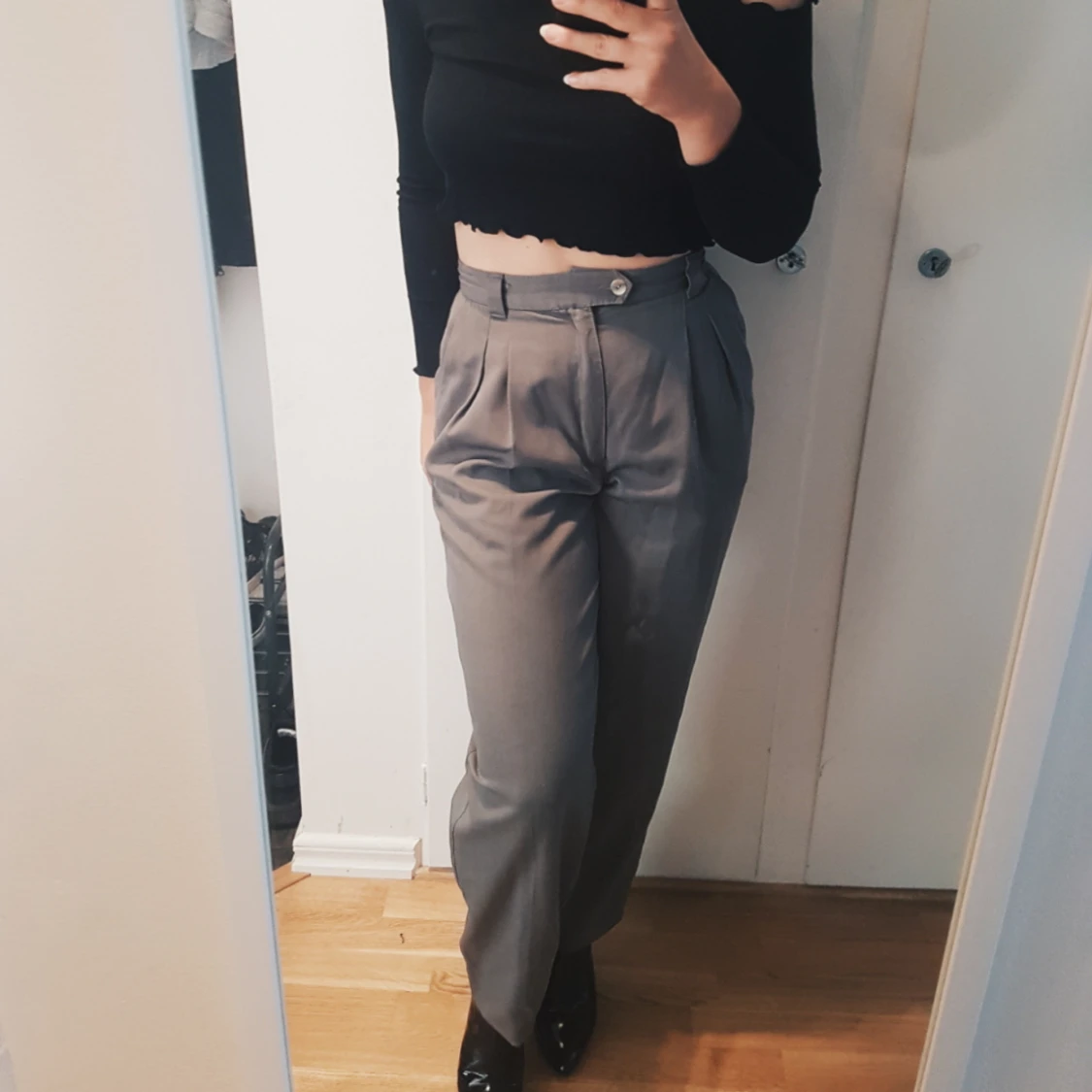 Grå kostymbyxor som verkligen framhäver midjan och även ger plats för den m lite större rumpa. De är strl 36 men de är ganska smala i midjan så skulle säga 34 i midjan och M i ben/rumpa. De är upplagda efter min längd (164 cm). Vid längre ben går det alldeles utmärkt att sprätta upp stygnen och violá!