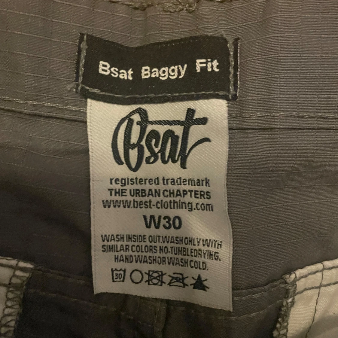 Säljer ett par grå cargobyxor från Bsat med baggy passform. Byxorna har flera praktiska fickor och är perfekta för en avslappnad stil. Midjemått W30.