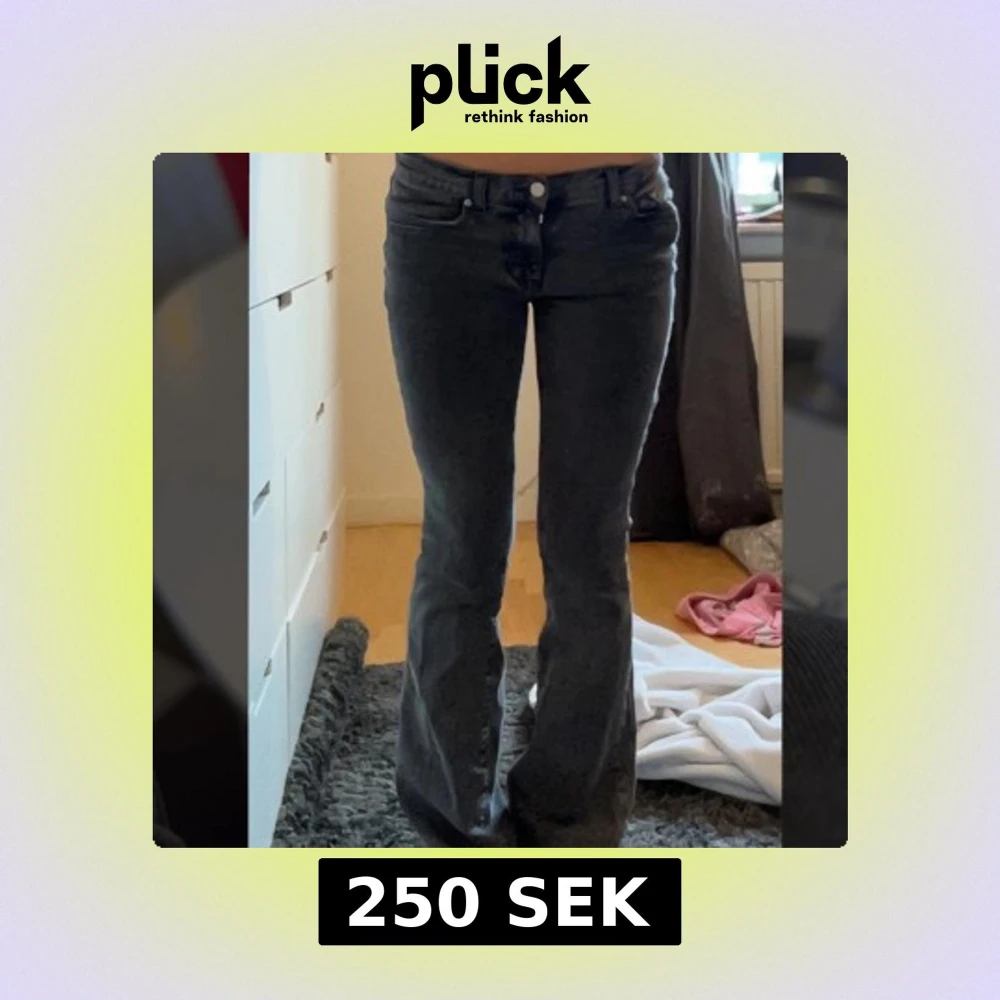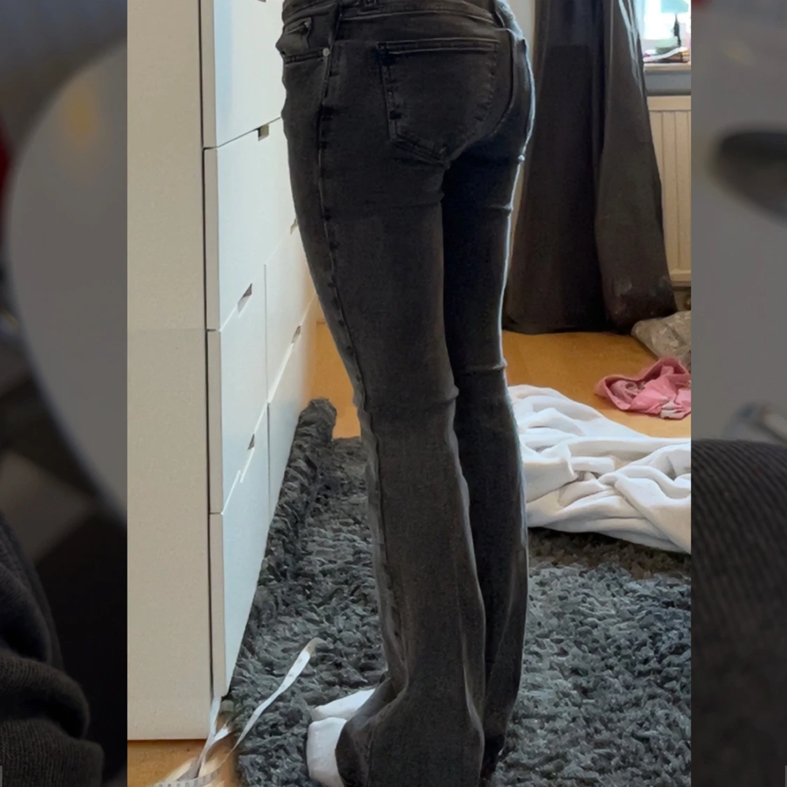 Säljer ett par gråa bootcut jeans med normal passform och klassisk femficksdesign. Jeansen har låg midja och stängs med dragkedja och knapp. Perfekta för dig som gillar en tidlös look med lite utsvängda ben.
