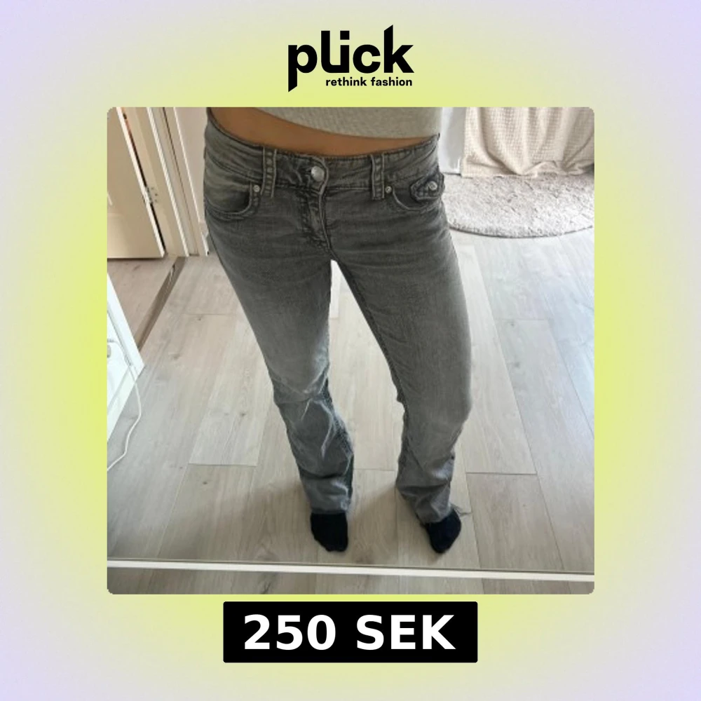 Jättesnygga lågmidjade gråa jeans från Gina! De är barnmodell 164 vilket är typ en XS/34. Har klippt dom där nere då de var lite långa för mig💕