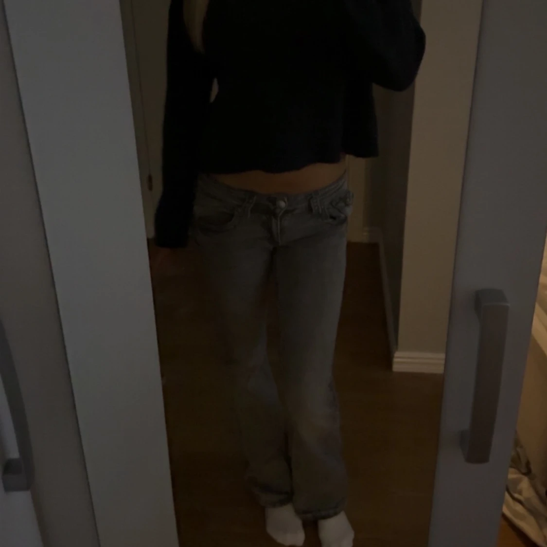 Säljer ett par gråa jeans med låg midja och bootcut-modell. Jeansen har klassisk femficksdesign och stängs med knapp och dragkedja.