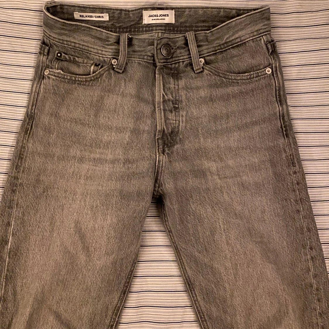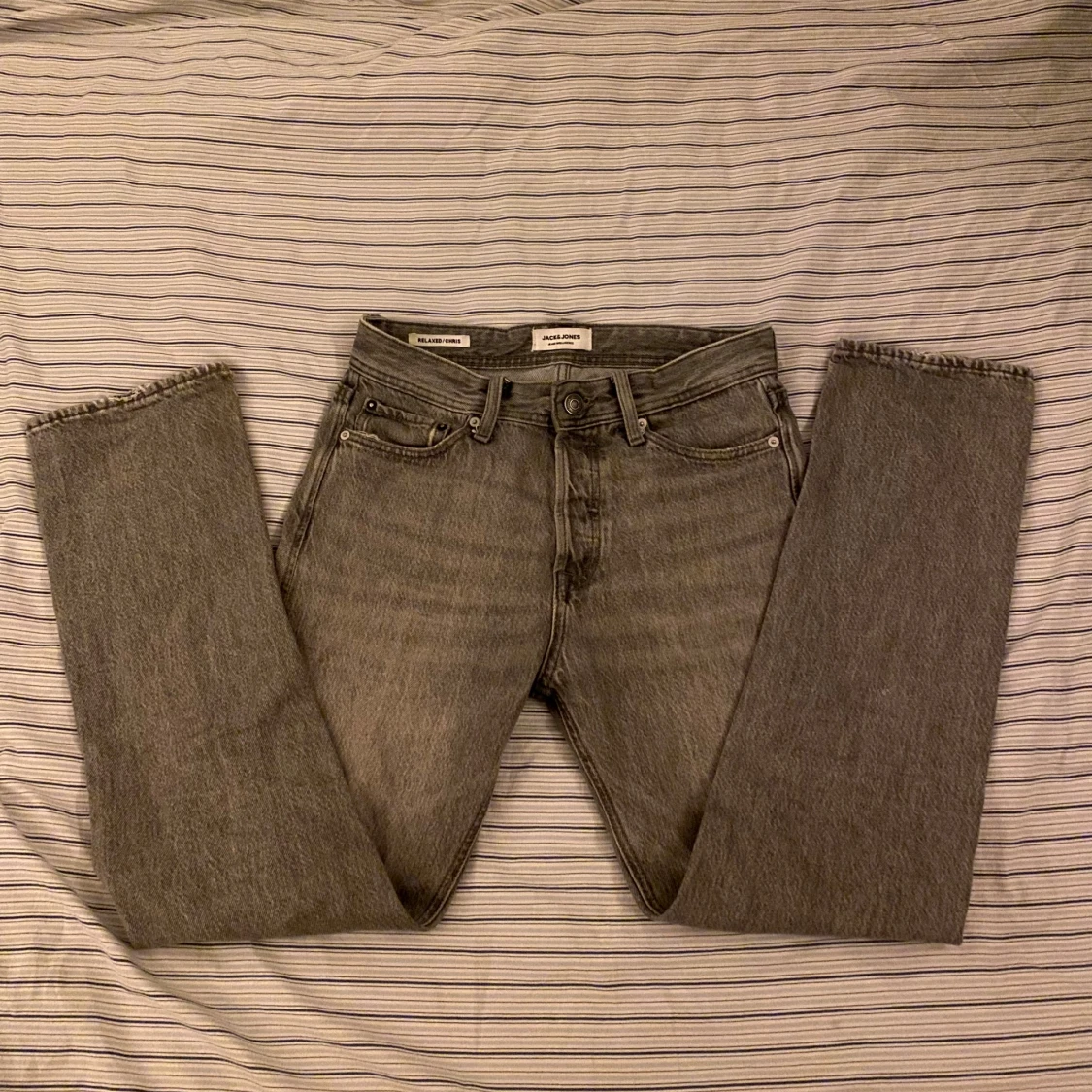 Säljer ett par gråa jeans från Jack & Jones, modell Relaxed/Chris. Jeansen har klassisk femficksdesign, raka ben och normal passform. Materialet är denim i bomull och de har råa, avklippta benslut för en avslappnad look. 28/32