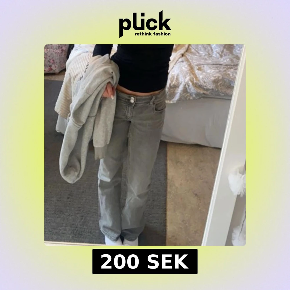 Säljer ett par gråa jeans med wide passform och låg midja. Byxorna har en vit stjärna broderad på bakfickan och klassiska fem fickor. Perfekta för en avslappnad och trendig look.