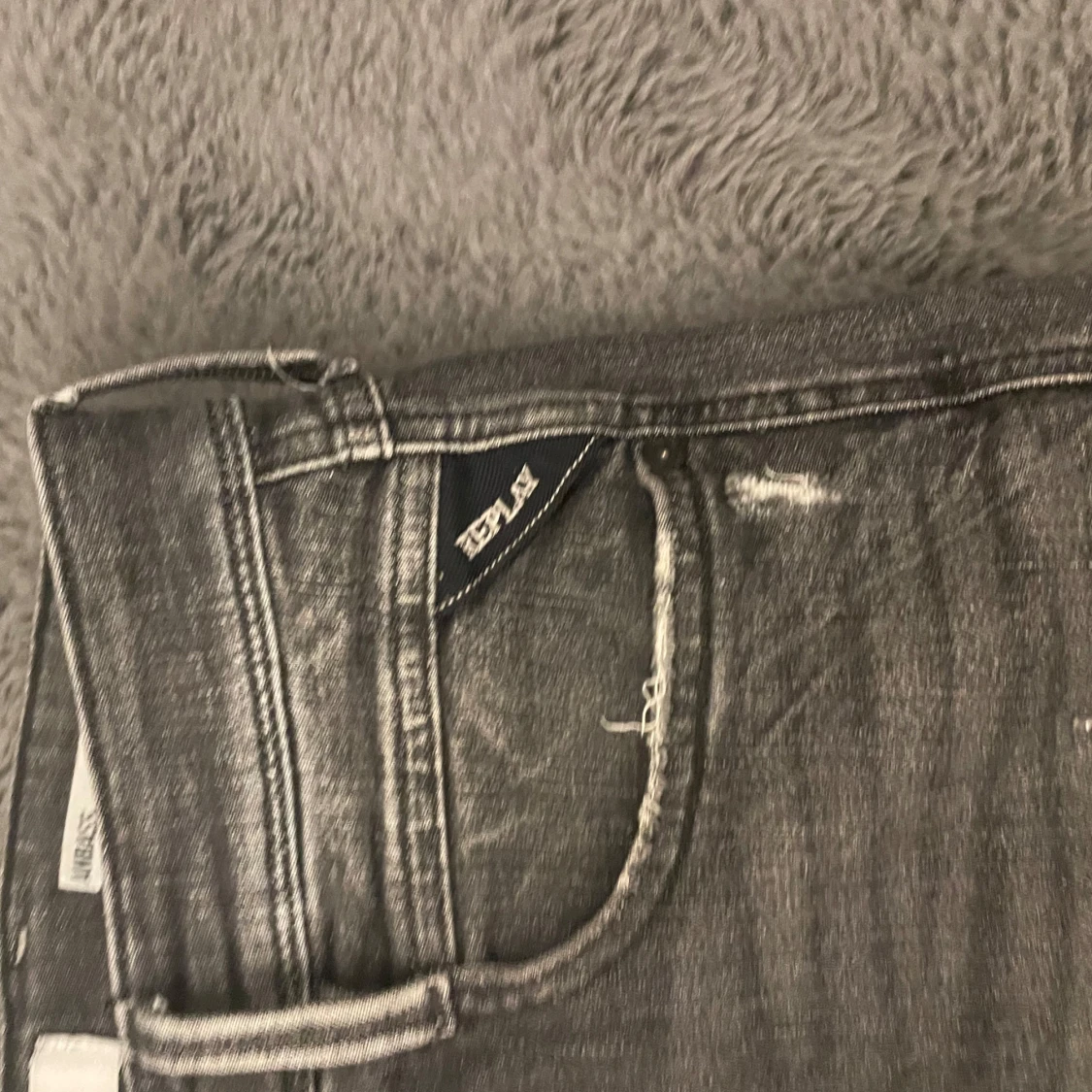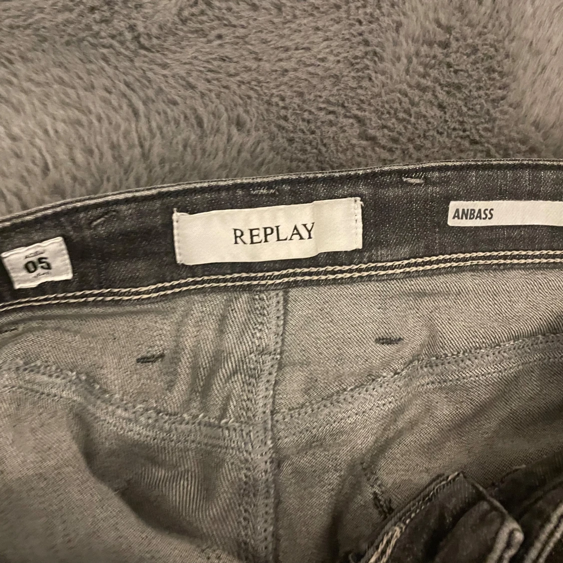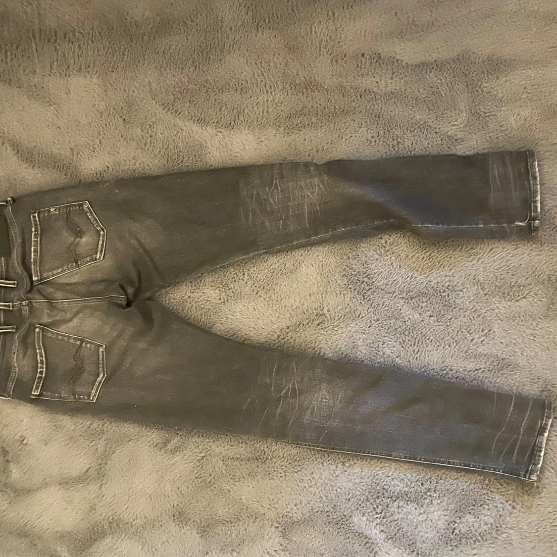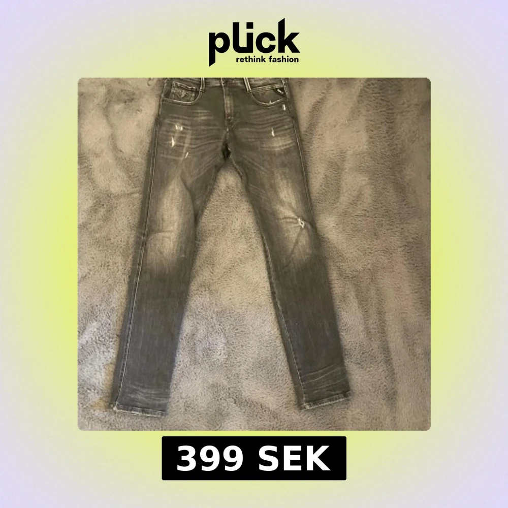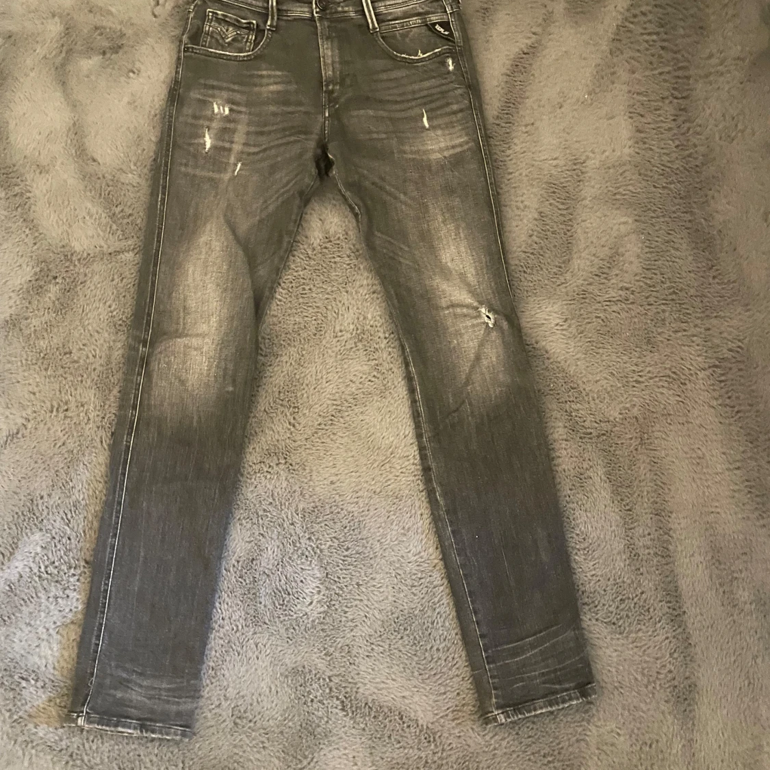 Snygga grå jeans från Replay, modell Anbass. De har en slim passform med slitna detaljer. Högt eftertraktade och säljs ej i butik längre. Perfekta för en avslappnad stil. Storlek 30/34
