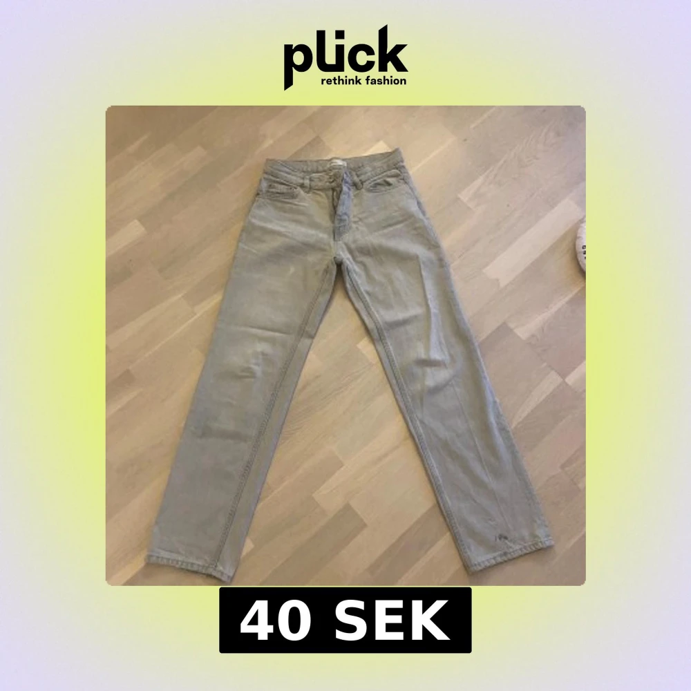 Gråa straight jeans från Gina Tricot, väl använda med en liten fläck längst ner på benet