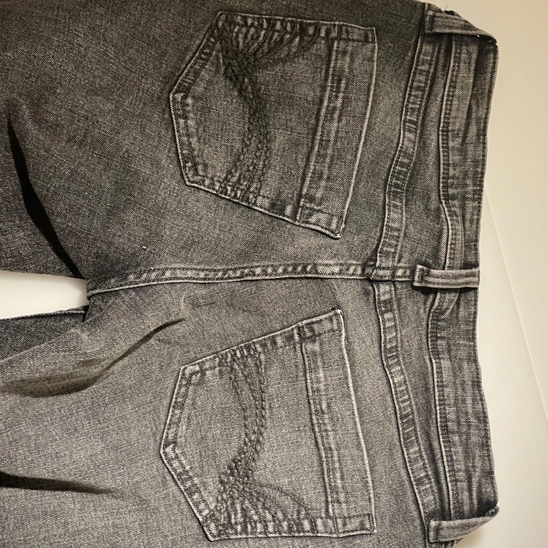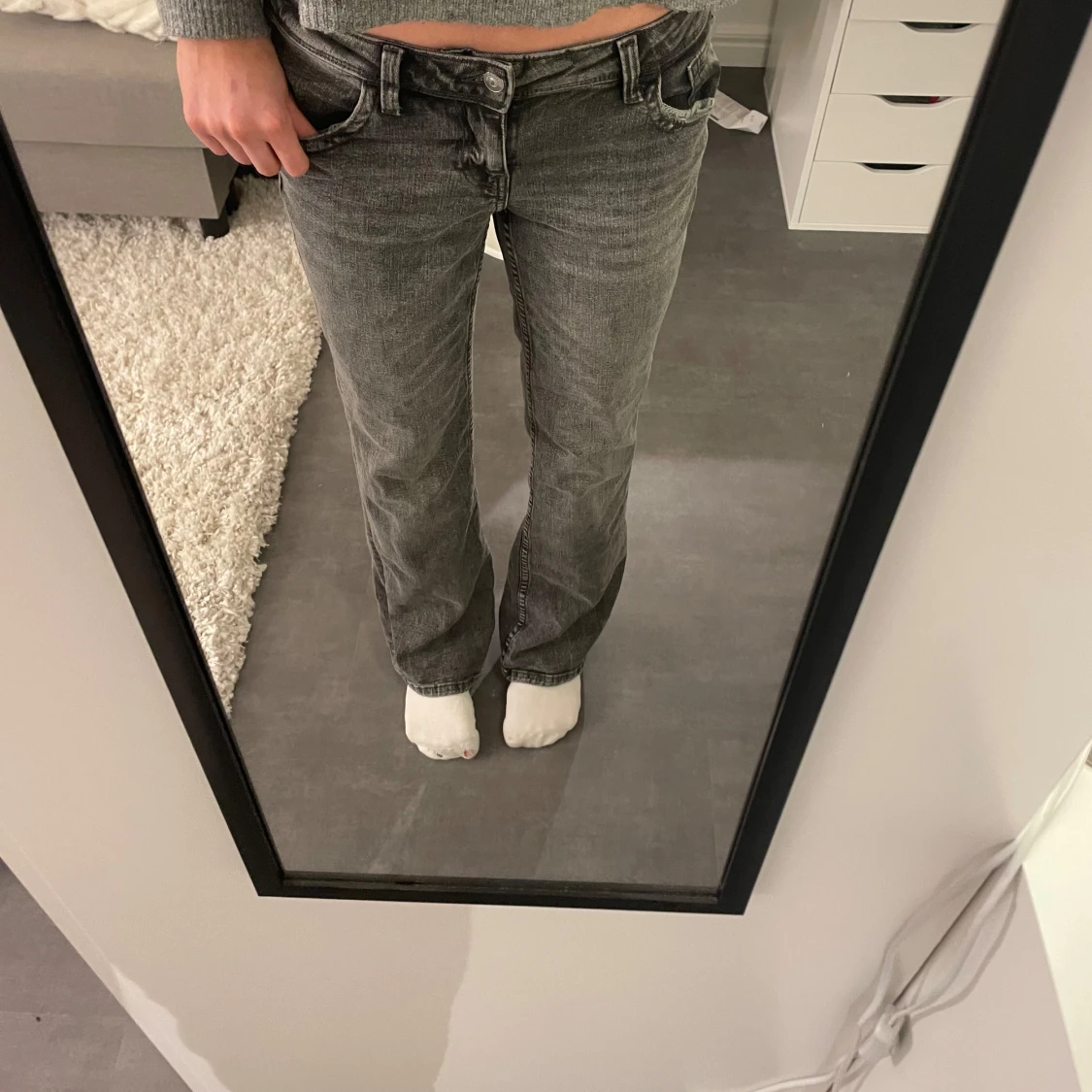 Snygga grå jeans med bootcut-stil och låg midja. Oanvända och säljer då de är lite stora. Storlek 38 ❤️