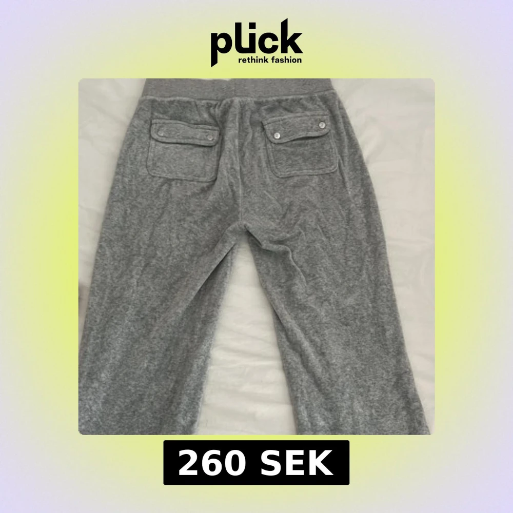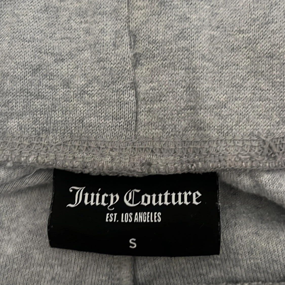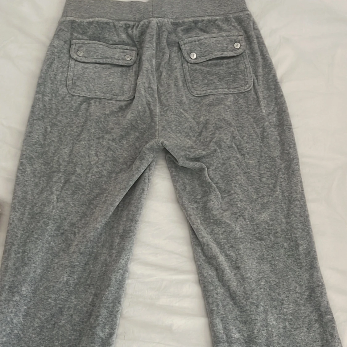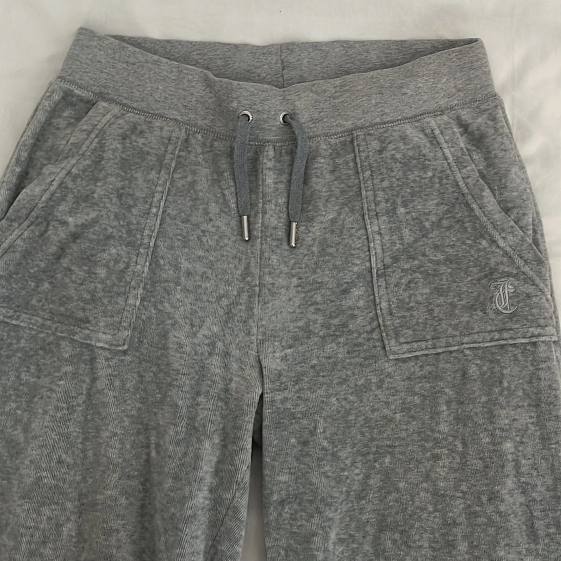 Grå mjukisbyxor från Juicy Couture med bred resår och snörning i midjan. Byxorna har två fickor fram och två bakfickor med lock och knappar. Mjukt material och diskret logga broderad på ena fickan. Perfekta för chill dagar.