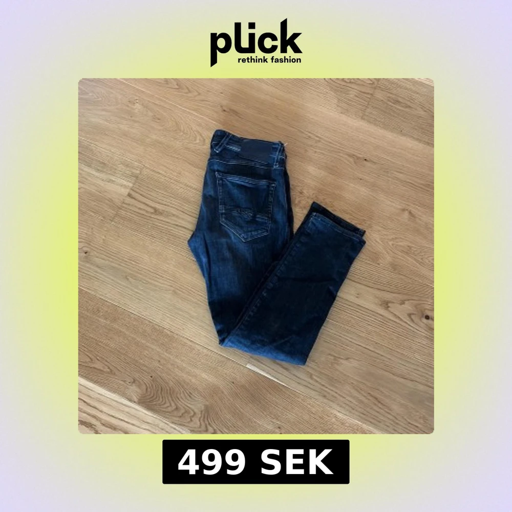 Säljer ett par Replay Anbass jeans i mörkblå tvätt med snyggt slitna detaljer. Modellen har smal passform och klassisk femficksdesign. Jeansen är tillverkade i stretchig bomull för extra komfort och har Replay-logga på fickan.