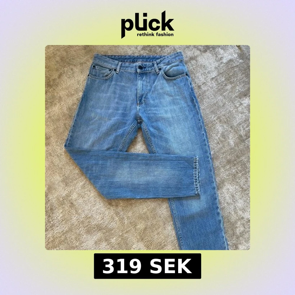Snygga blå jeans från Whyred i klassisk rak modell. Jeansen har fem fickor, bälteshällor och stängs med knapp och dragkedja. Tillverkade i slitstarkt bomullsjeans med ljus tvätt och diskreta slitningar. Perfekta till sneakers eller boots.