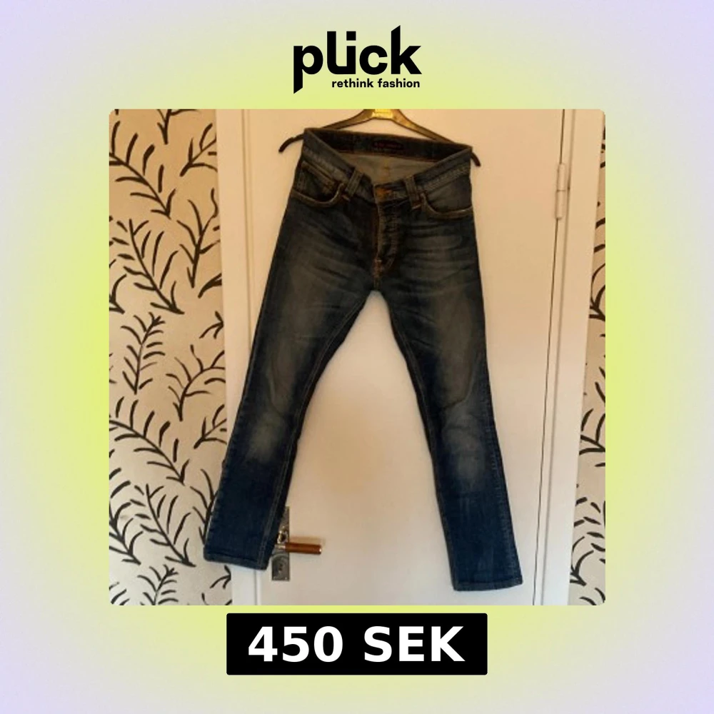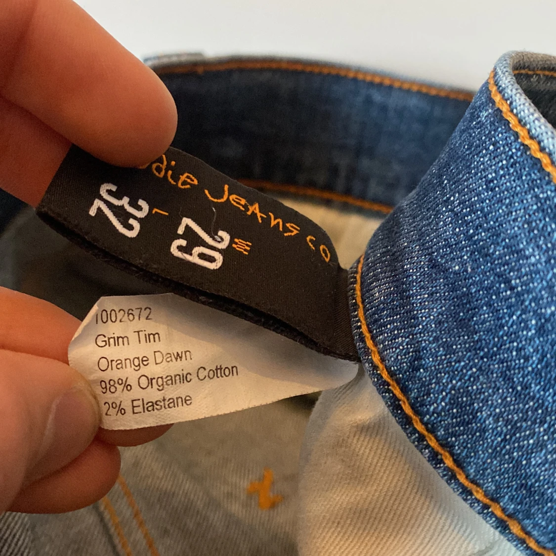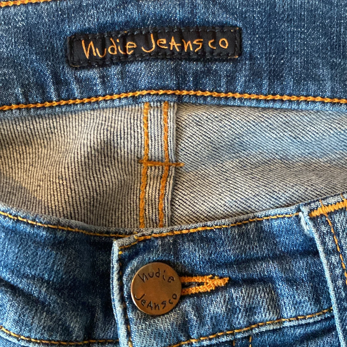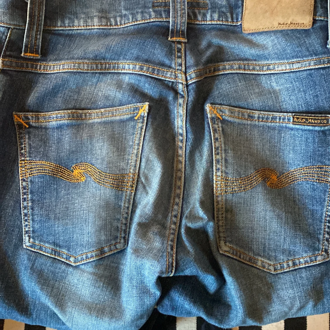 Säljer ett par nudie jeans i model Grim Tim i storlek 29W 32W. Byxorna är blå och har en fet fade