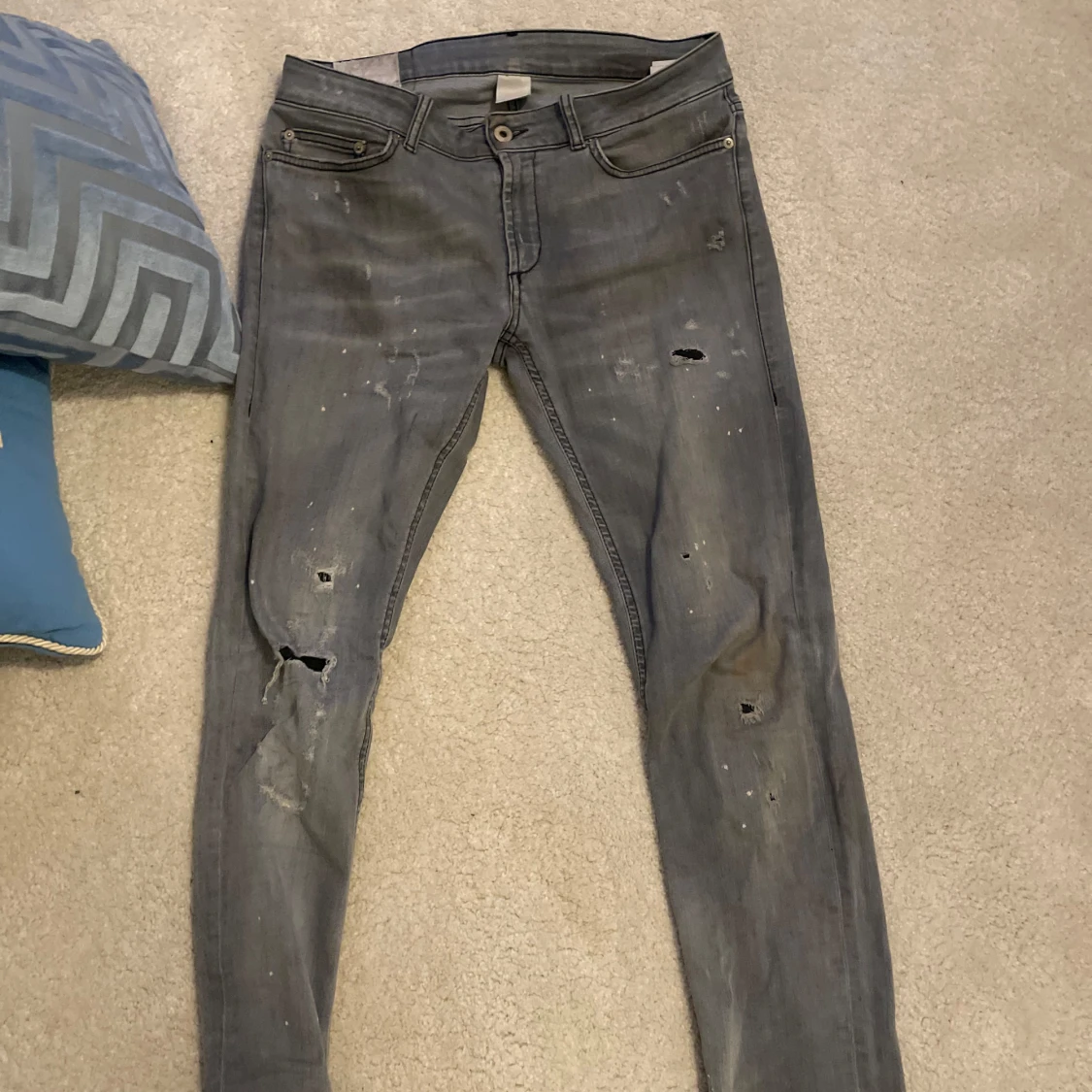 Snygga grå jeansbyxor med slitningar för en trendig look. De har en klassisk femficksdesign och en knappgylf. Perfekta för en avslappnad stil.
