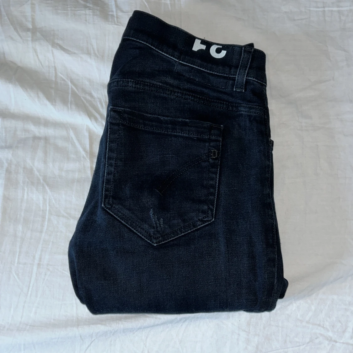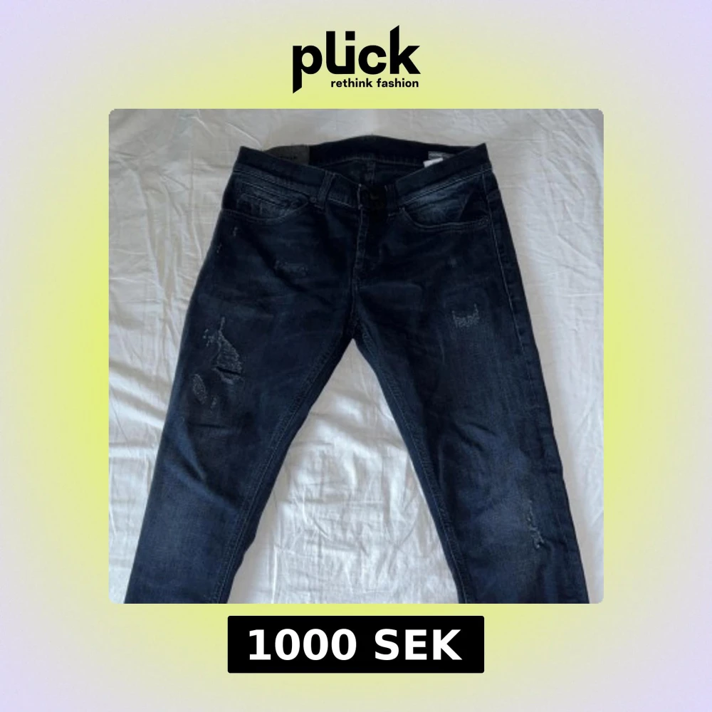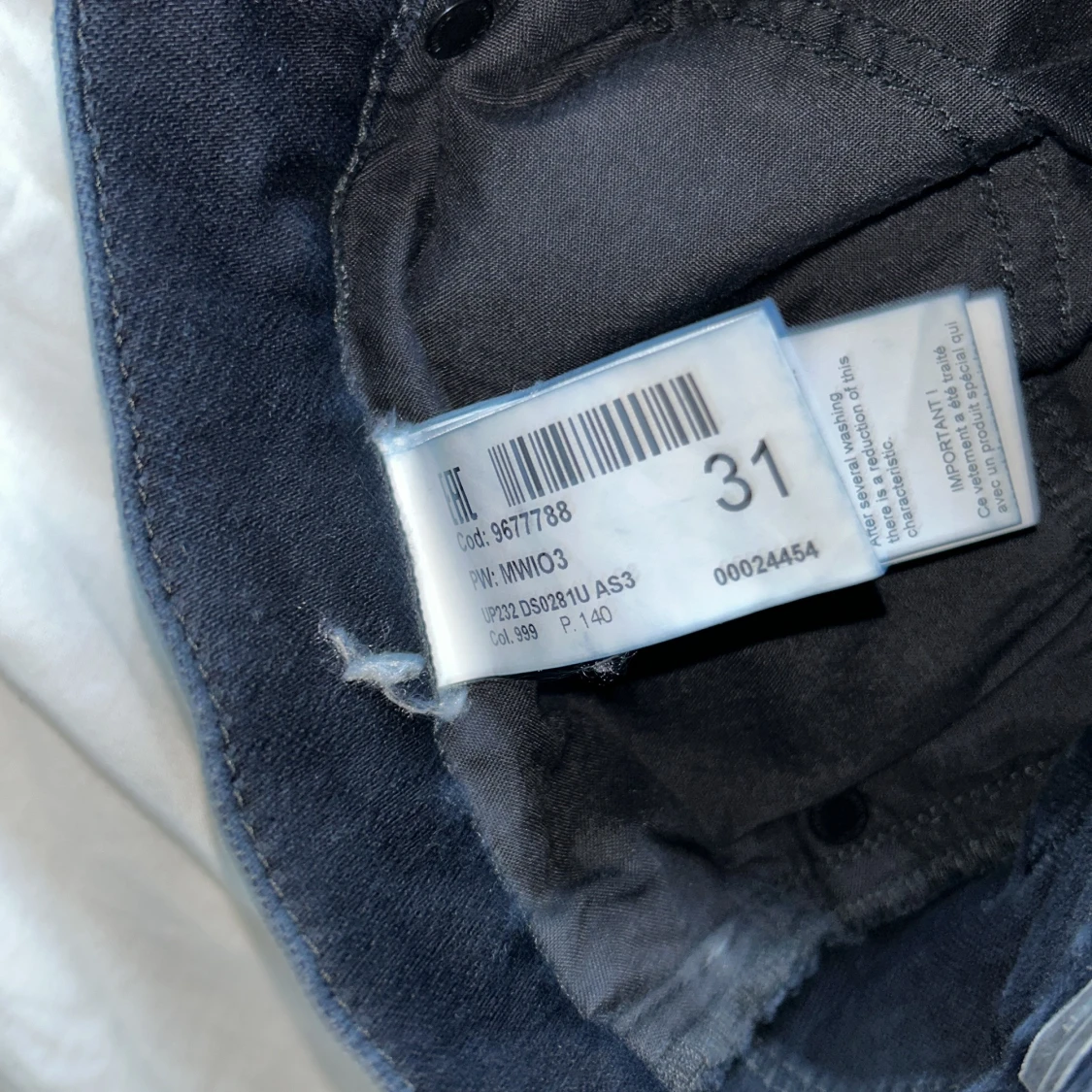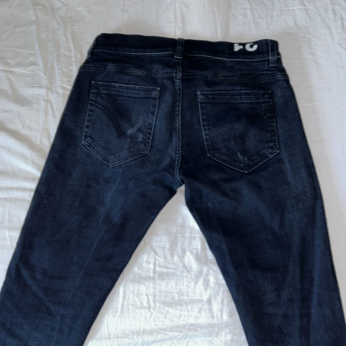 Snygga mörkblå jeans med en klassisk femficksdesign. De har en lätt slitning på framsidan för en trendig look. Perfekta för en avslappnad stil. Skick9/10 knappt använda. Kontakta mig om frågor