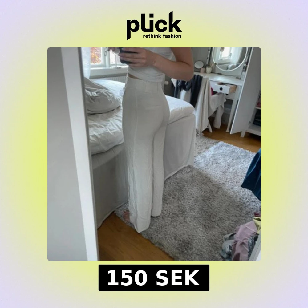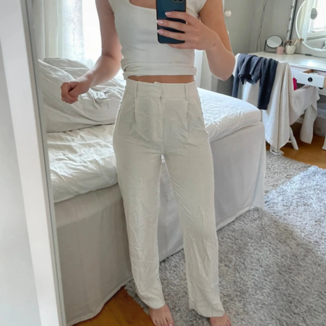 Snygga vita linnebyxor från Gina Tricot i storlek 34. Byxorna är högmidjade med raka ben och har bälteshällor samt diskreta fickor bak. Perfekta för en fräsch och stilren look under varmare dagar. Från Premium Kollektionen och knappast använda!