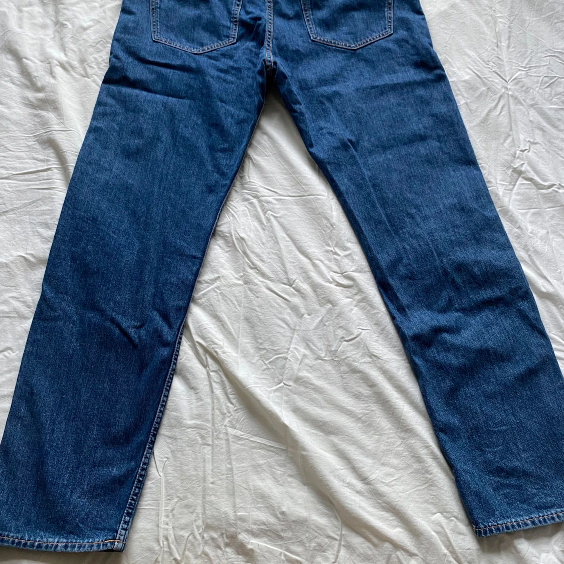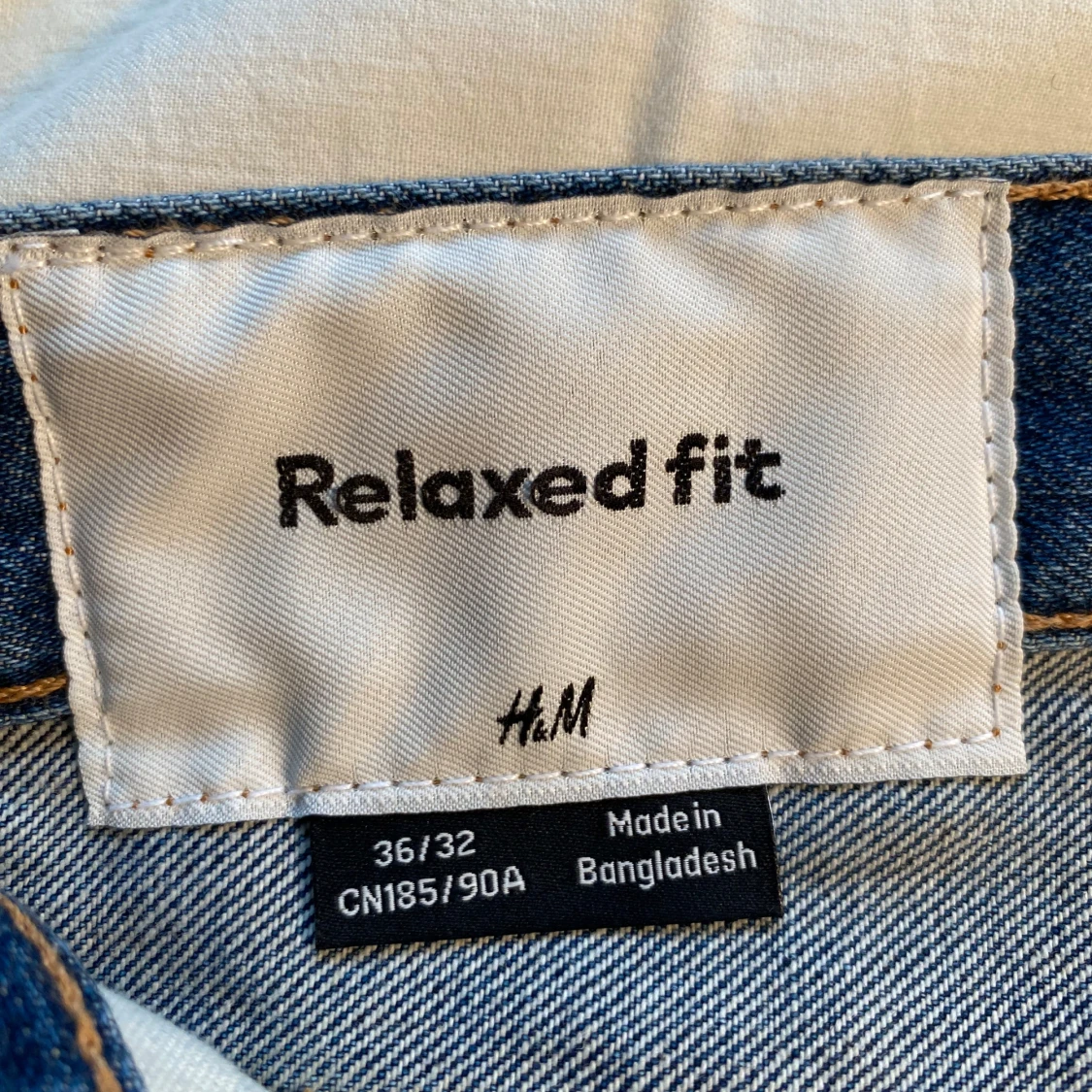 Säljer ett par blå jeans från H&M i relaxed fit. De har en klassisk design med fem fickor och en bekväm passform. Perfekta för en avslappnad stil.