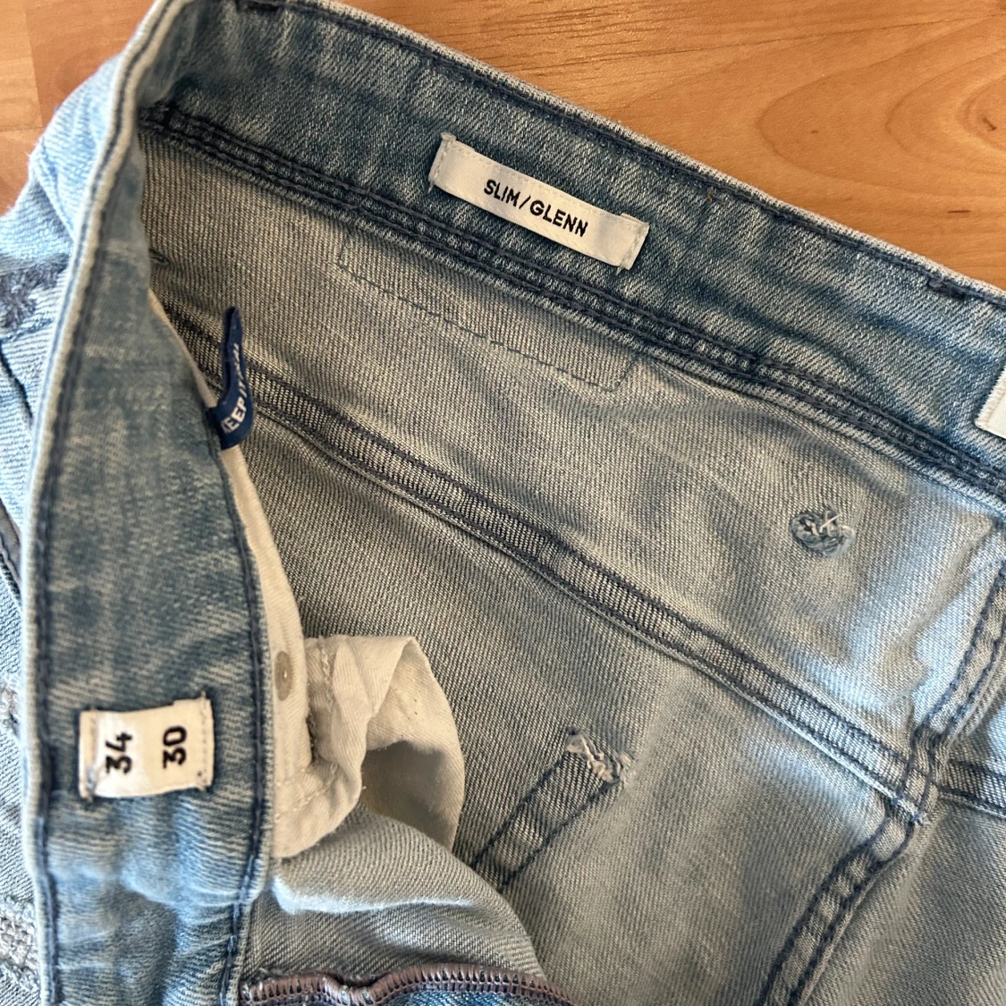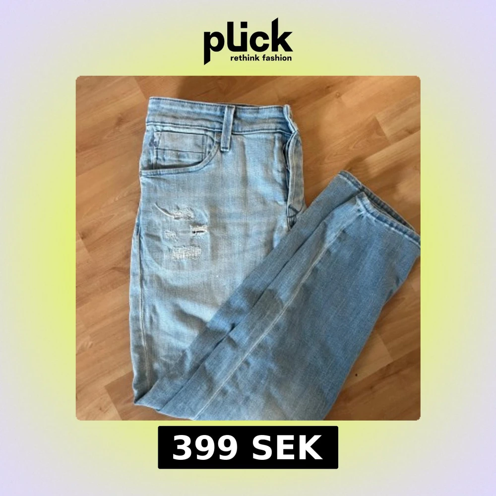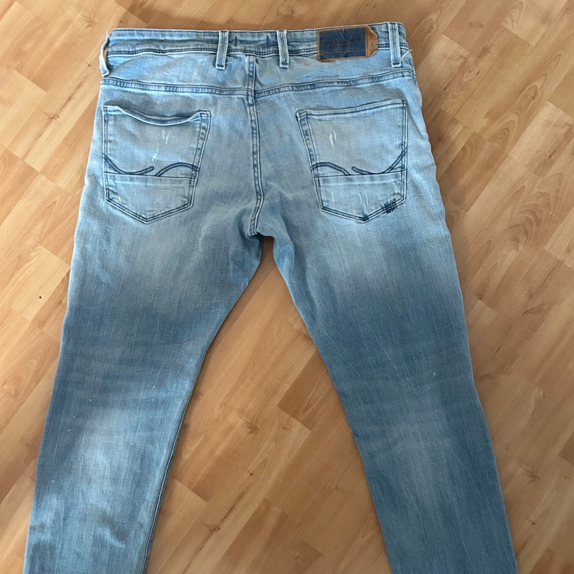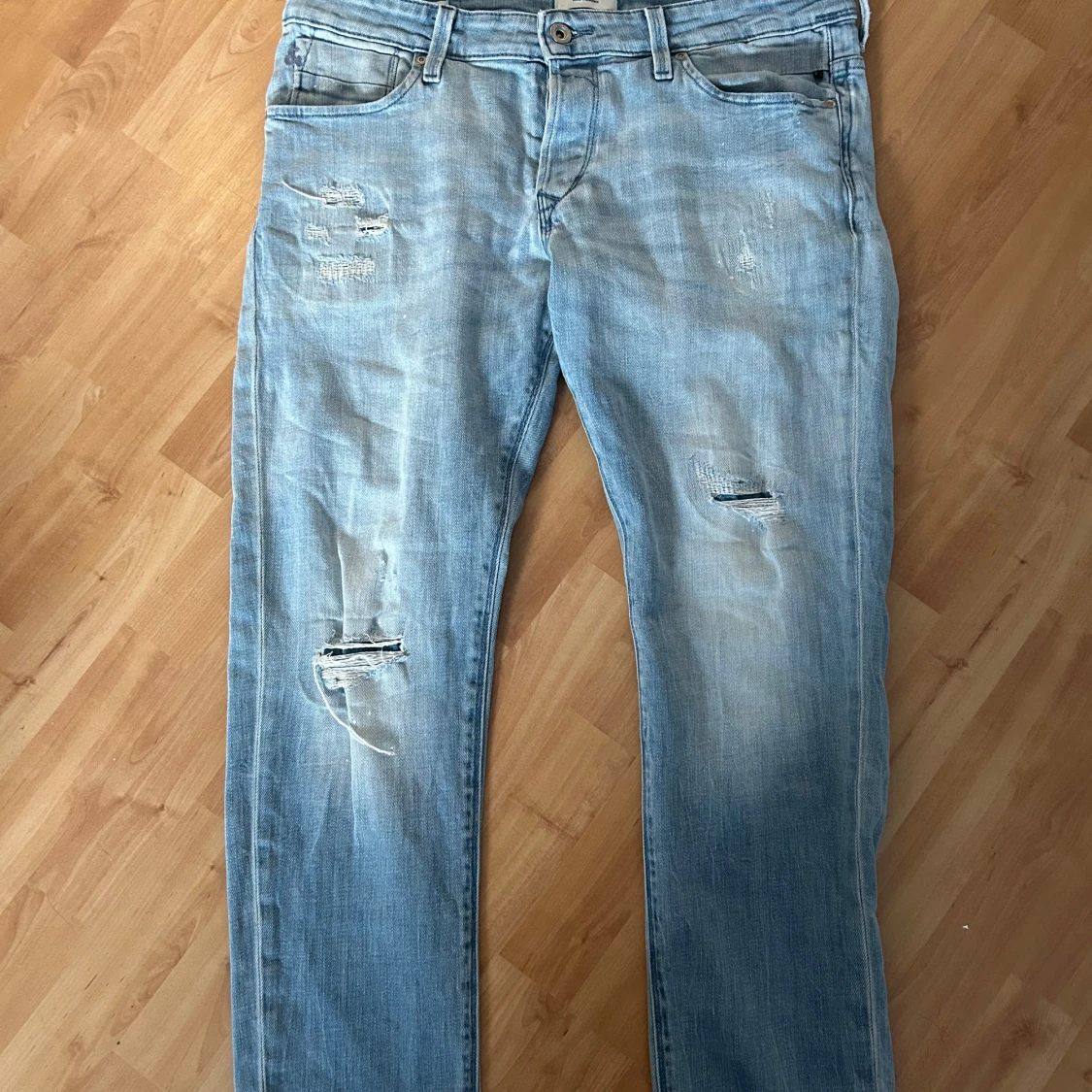 Sköna ljusblåa jeans från Jack & Jones med slitningar på framsidan. Byxorna har en slim passform