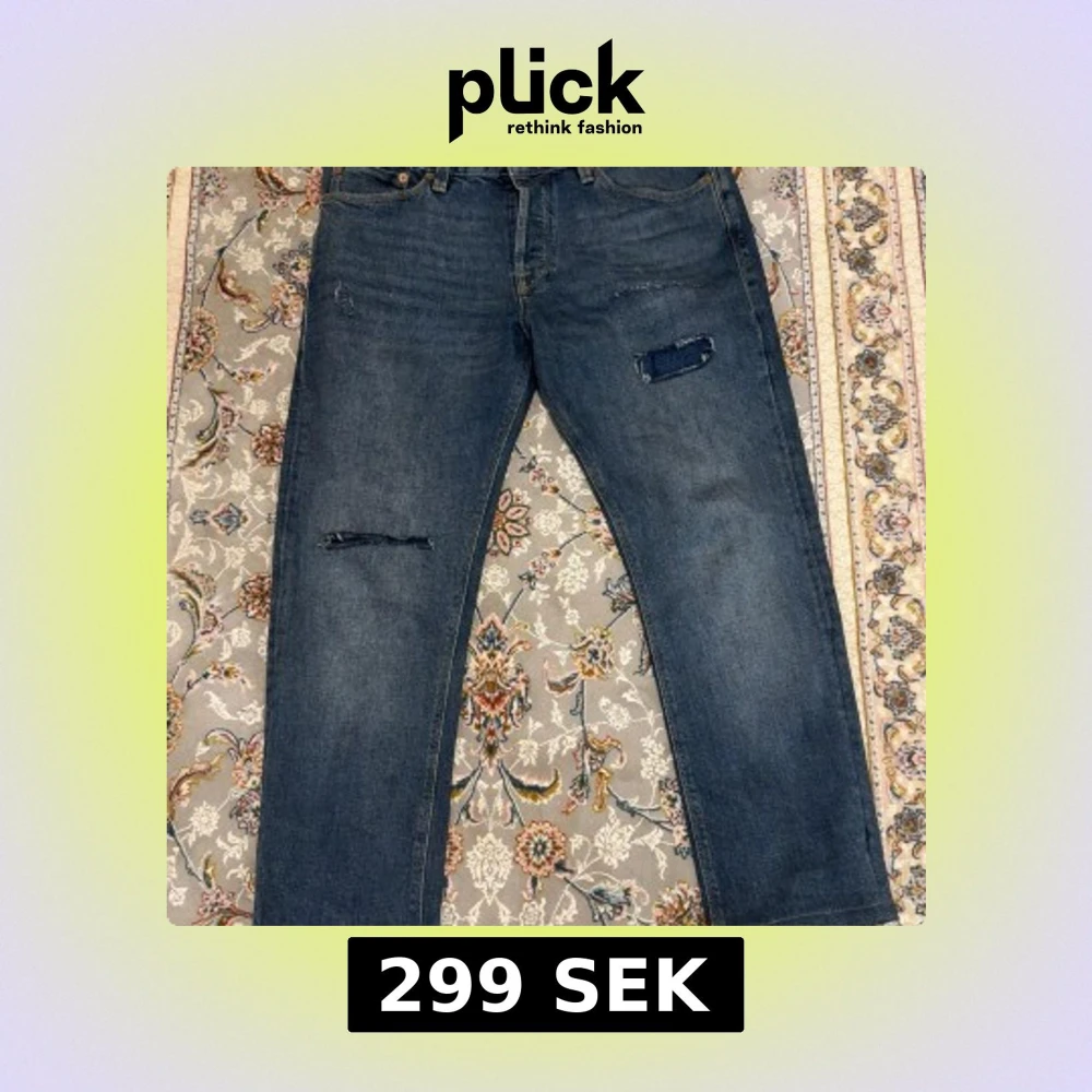Säljer ett par blå jeans med raka ben och slitningar på framsidan. Jeansen är gjorda i robust denim. Rensar garderoben därav säljer jag dem. Hör av er vid intresse