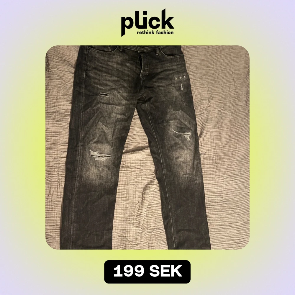Säljer ett par svarta jeans från Jack & Jones i modellen Tapered/Mike. De har en cool slitningseffekt och är i bra skick. Perfekta för en avslappnad stil med en touch av edge. Passar både till vardags och fest!