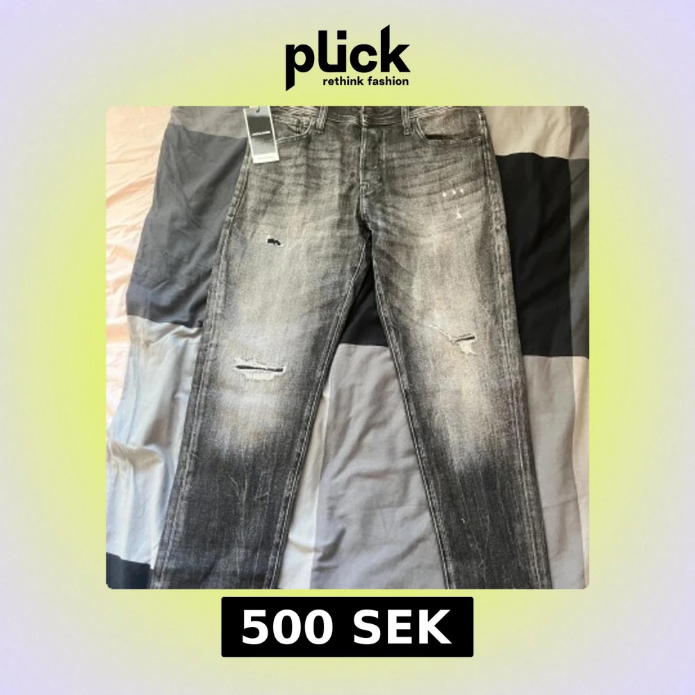 Säljer ett par grå jeans från Jack & Jones, modell Mike Tapered. Jeansen har slitna detaljer och en tvättad look med dragkedja i gylfen. Passformen är regular rise och tapered leg. Perfekta för en avslappnad stil. Storlek W-33/L-32. Helt nya och och oanvända köpt för 600kr från Zalando