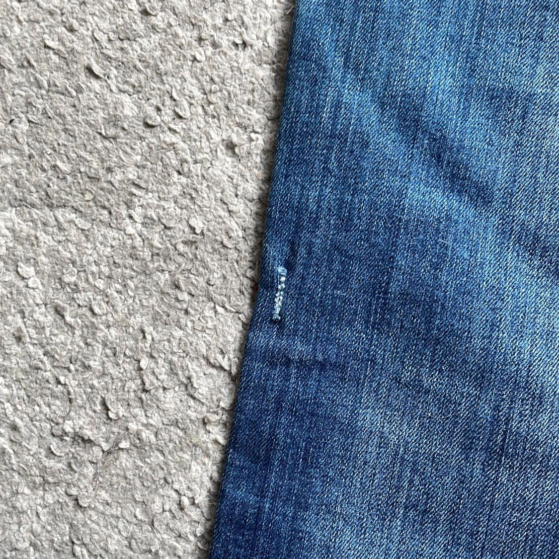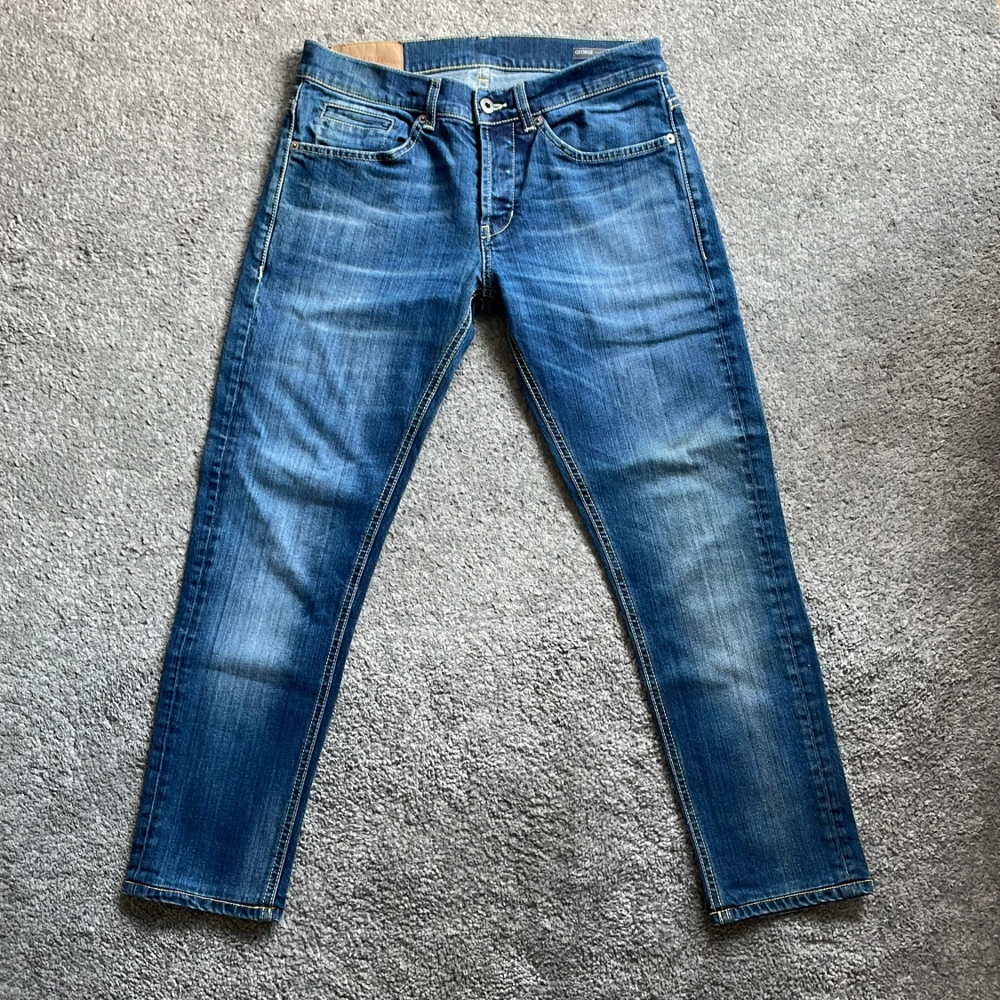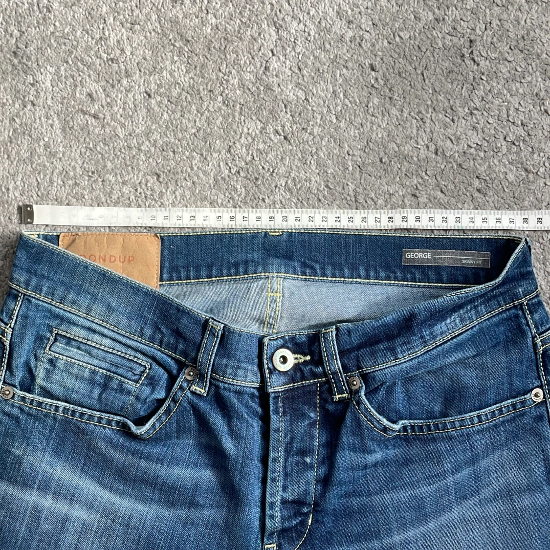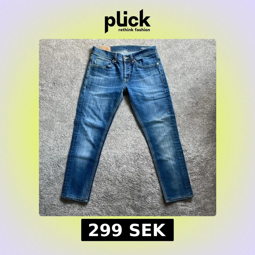 Mörkblåa dondup jeans i bra skick. Det står storlek 33 på jeansen men skulle mer säga att det är som W28. Jeansen saknar D:et på bakfickan för att det har lossnat. Jeansen har ett litet stygn på vänster vad på baksidan, men stygnet är bara 1-cm så inget som stör mycket! Jeansen är 90cm långa! Skicka gärna om ni vill ha mer bilder med mått på jeansen eller om ni undrar över något annat!