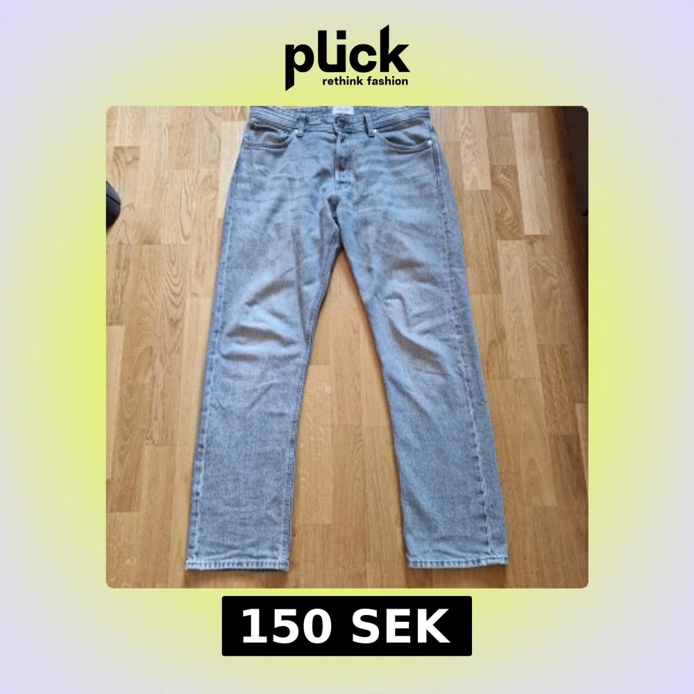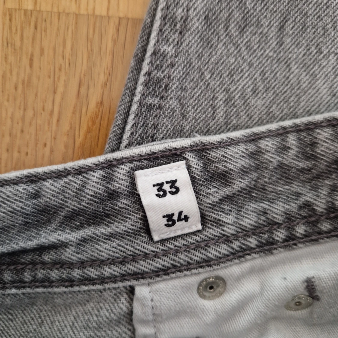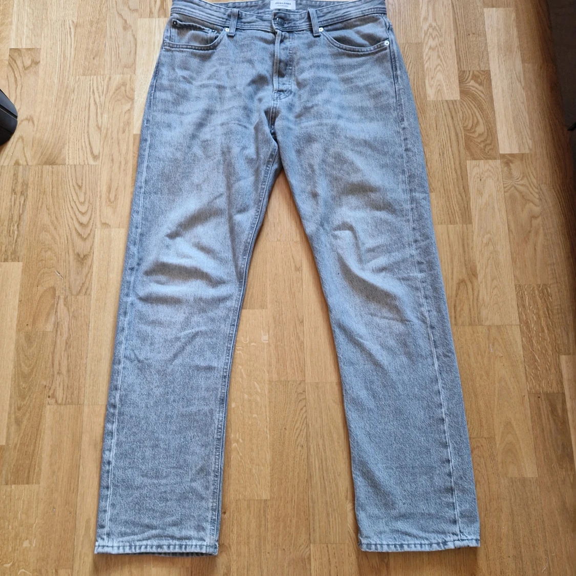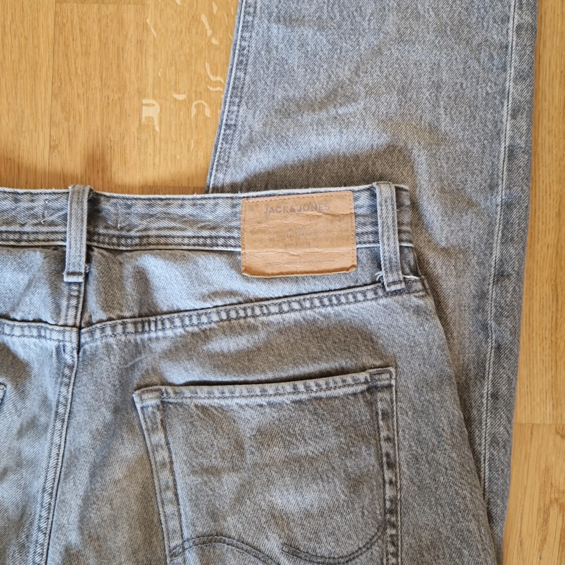Säljer ett par klassiska grå jeans från Jack & Jones med raka ben och fem fickor. Jeansen har normal passform och stängs med dragkedja och knapp. Perfekta till vardags för en stilren look.