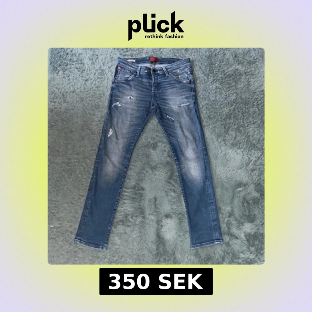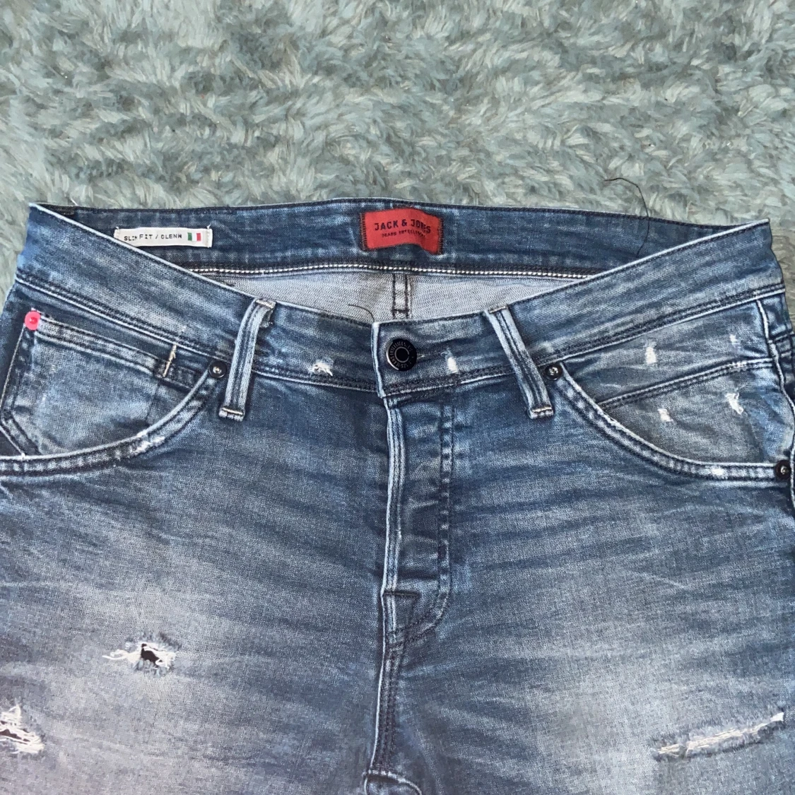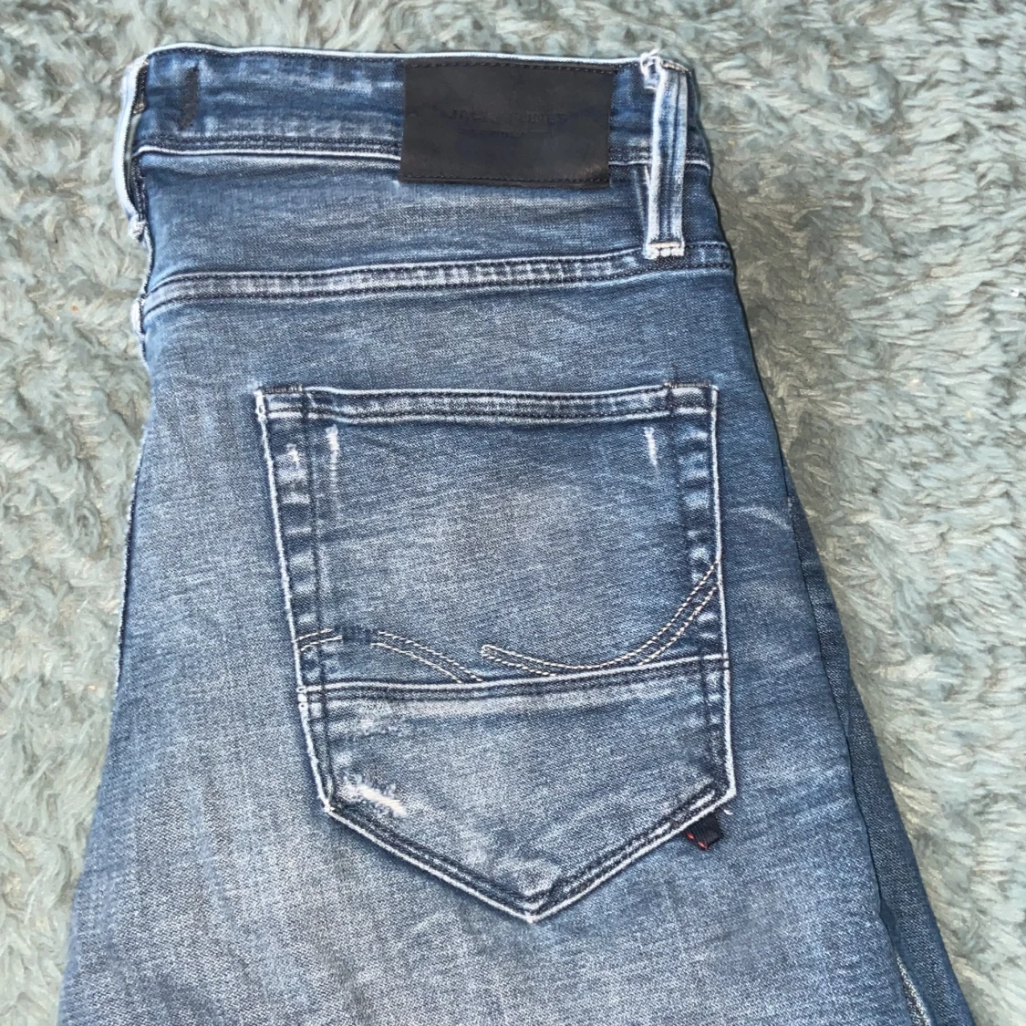 Säljer ett par blå jeans från Jack & Jones med slitningar och lätt tvättad look. Storlek 33/32. Byxorna har fem fickor, dragkedja och knapp i midjan. Skinny/slim passform och normal midja. Perfekta för en avslappnad stil.