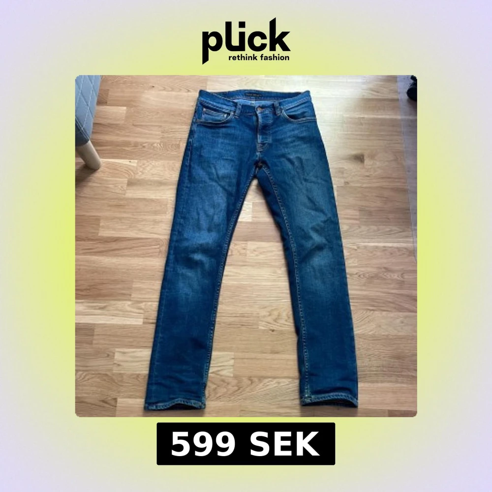Säljer ett par klassiska blå jeans från Nudie Jeans med orangea sömmar och snygga bakfickor med vågdetalj. Modellen är Grim Tim med normal passform och raka ben. Materialet är 99% bomull och 1% elastan för lite stretch.