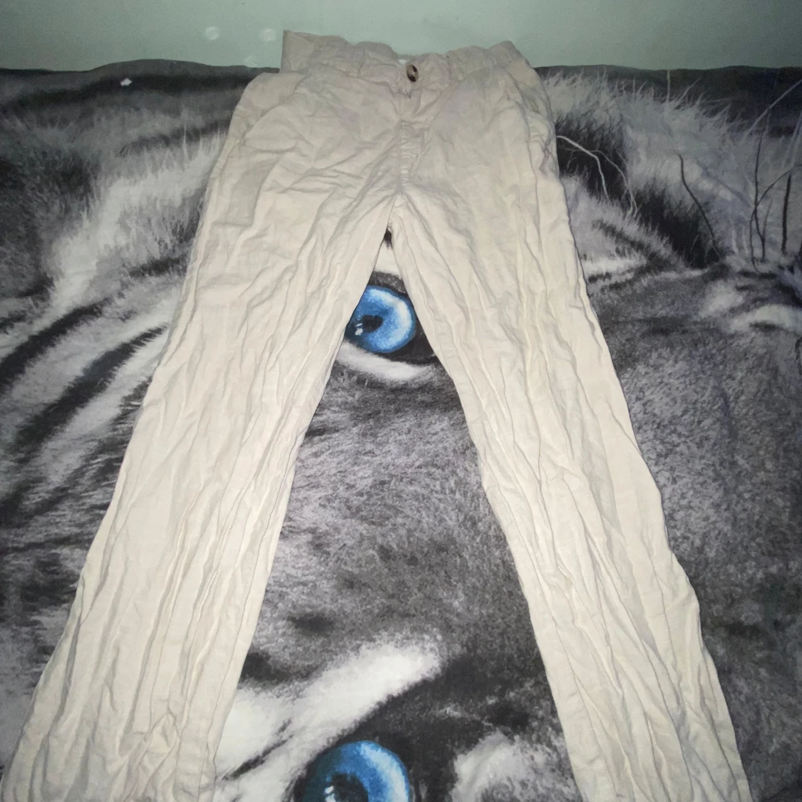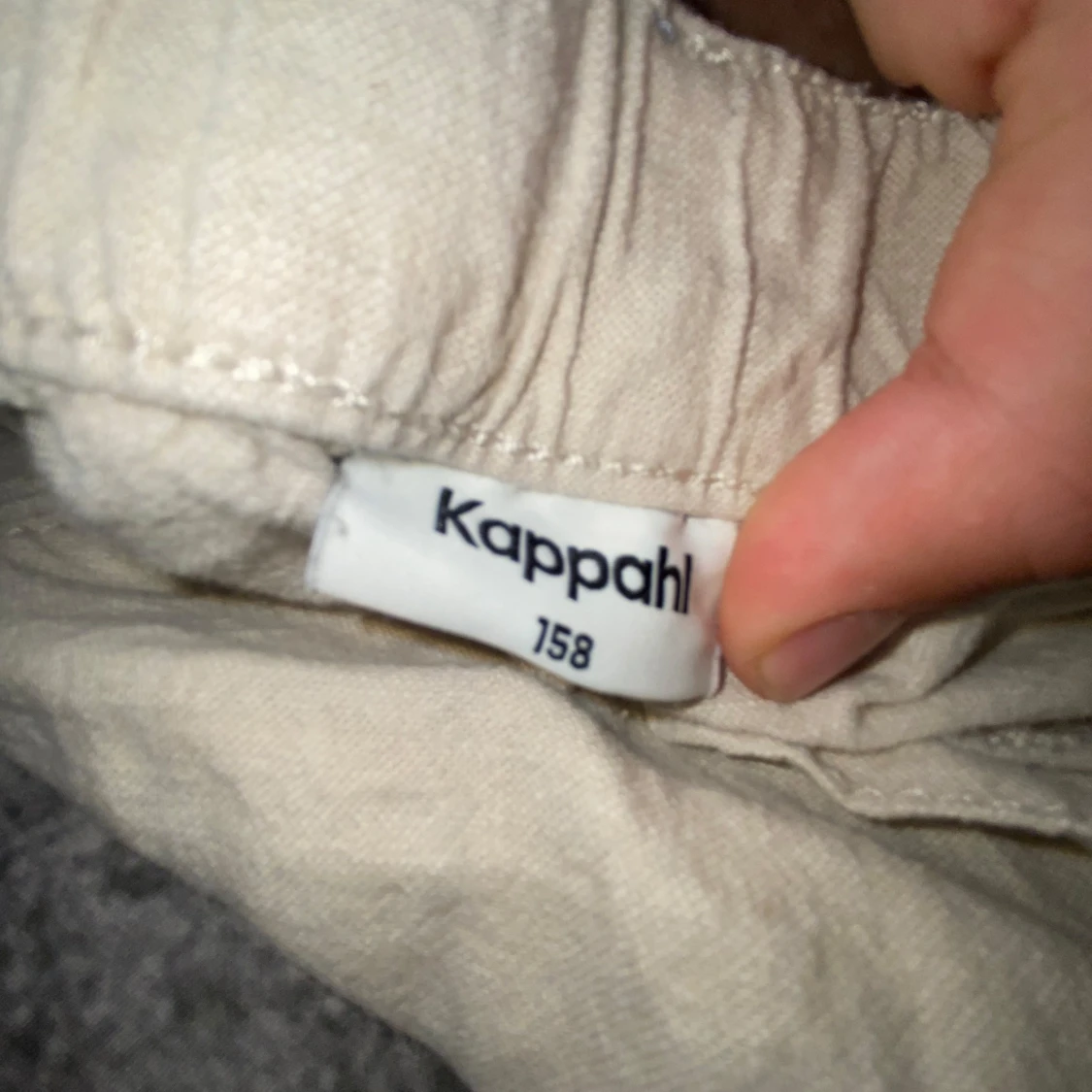 Snygga och lätta beiga linnebyxor från Kappahl i storlek 158. Byxorna har rak passform och är tillverkade i ett luftigt linnematerial, perfekta för varmare dagar. Klassisk design med knapp och resår i midjan för extra komfort. För endast 150kr!!