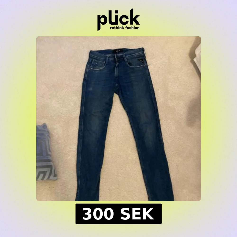 Snygga blå jeansbyxor med en klassisk femficksdesign. De har en dragkedja och knapp framtill. Perfekta för en avslappnad stil. Dock så har en av fickorna på jeansen nästan gått av.