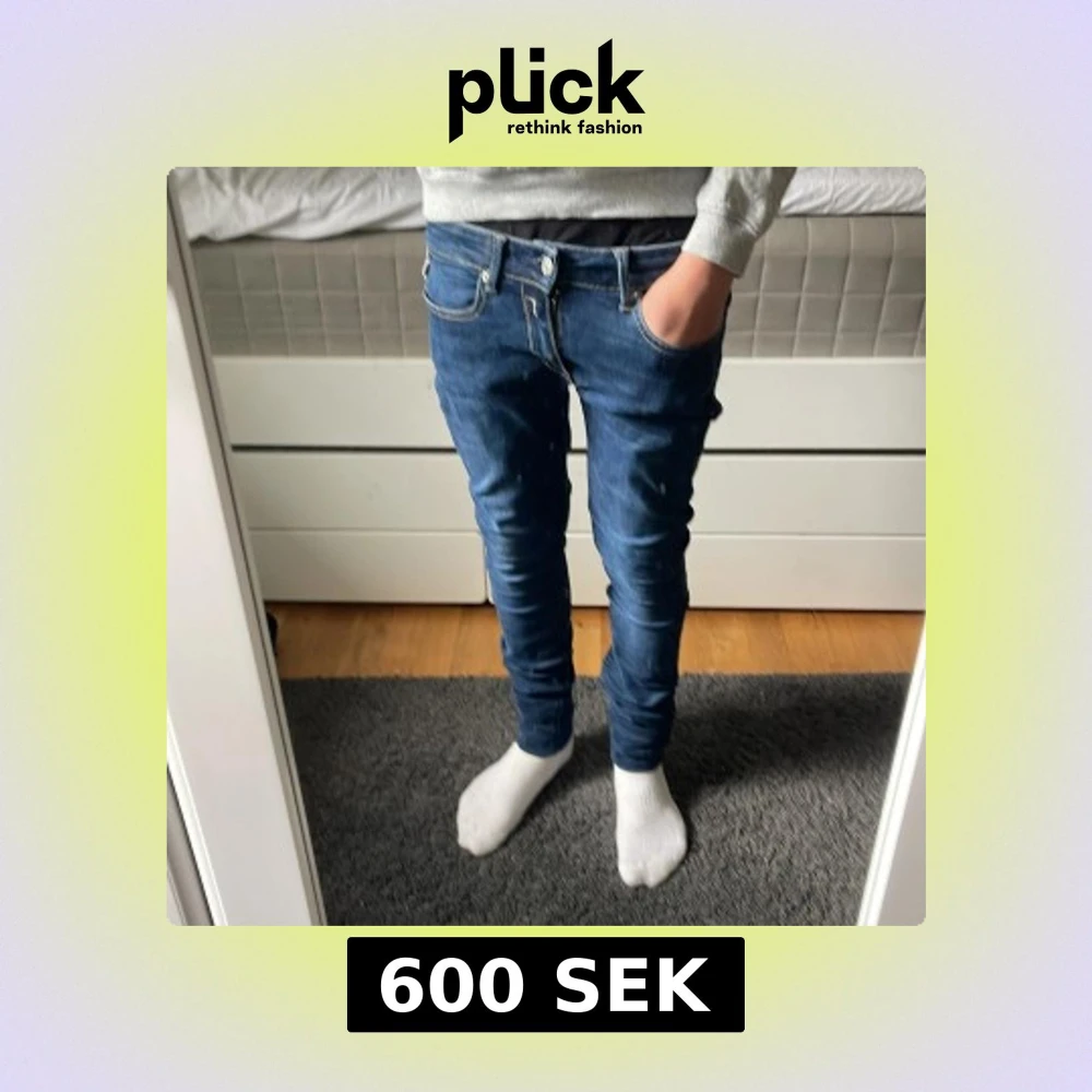Säljer ett par blå Replay jeans med slim passform. Klassisk femficksmodell med vita kontrastsömmar och Replay-logga på fickan. Jeansen är tillverkade i stretchigt denim. Jag är 169 och hsr vikt in dem en liten bit som ni ser på bilden så dem passar kanske lite längre väldigt bra används inga defekter alls