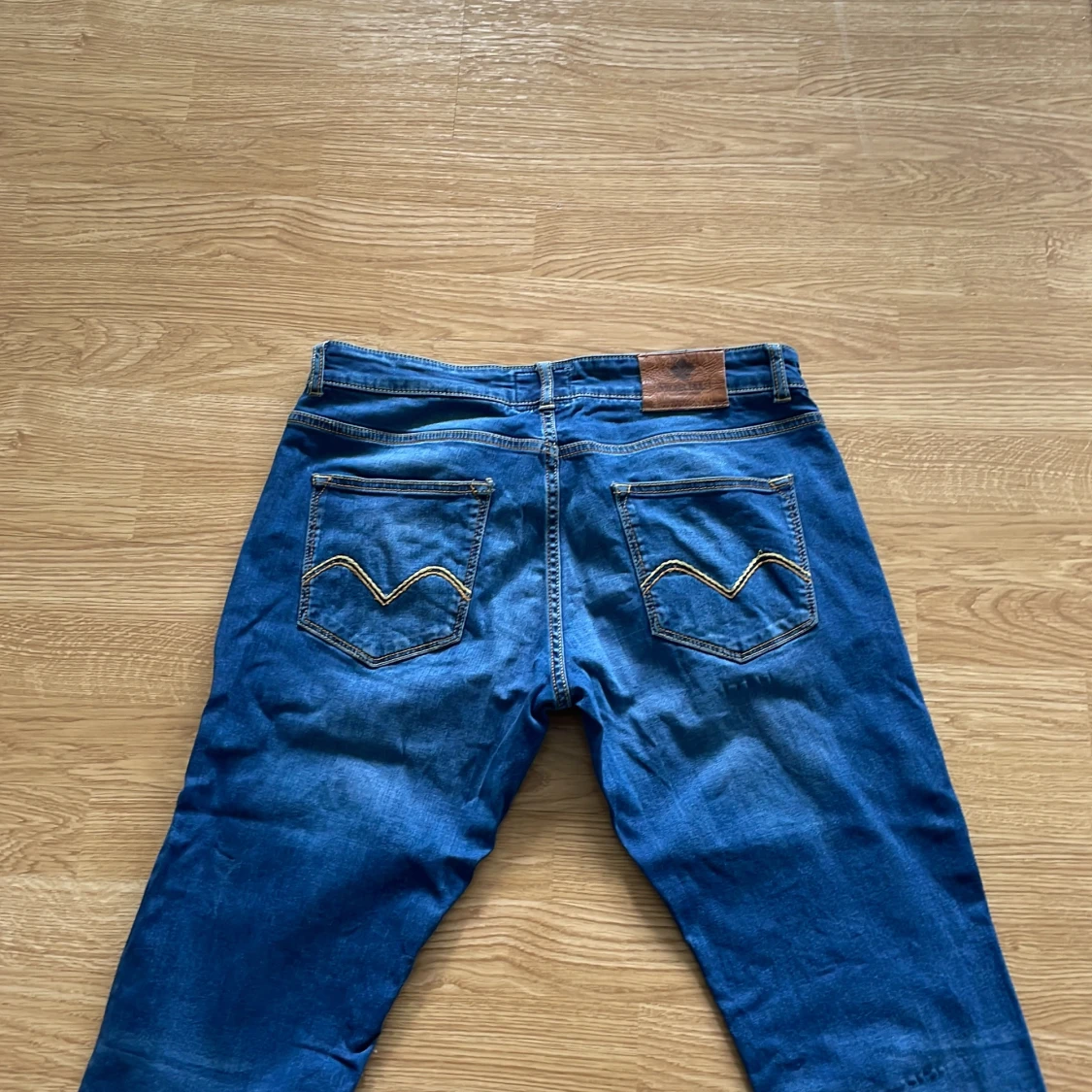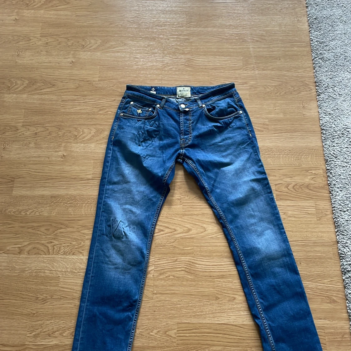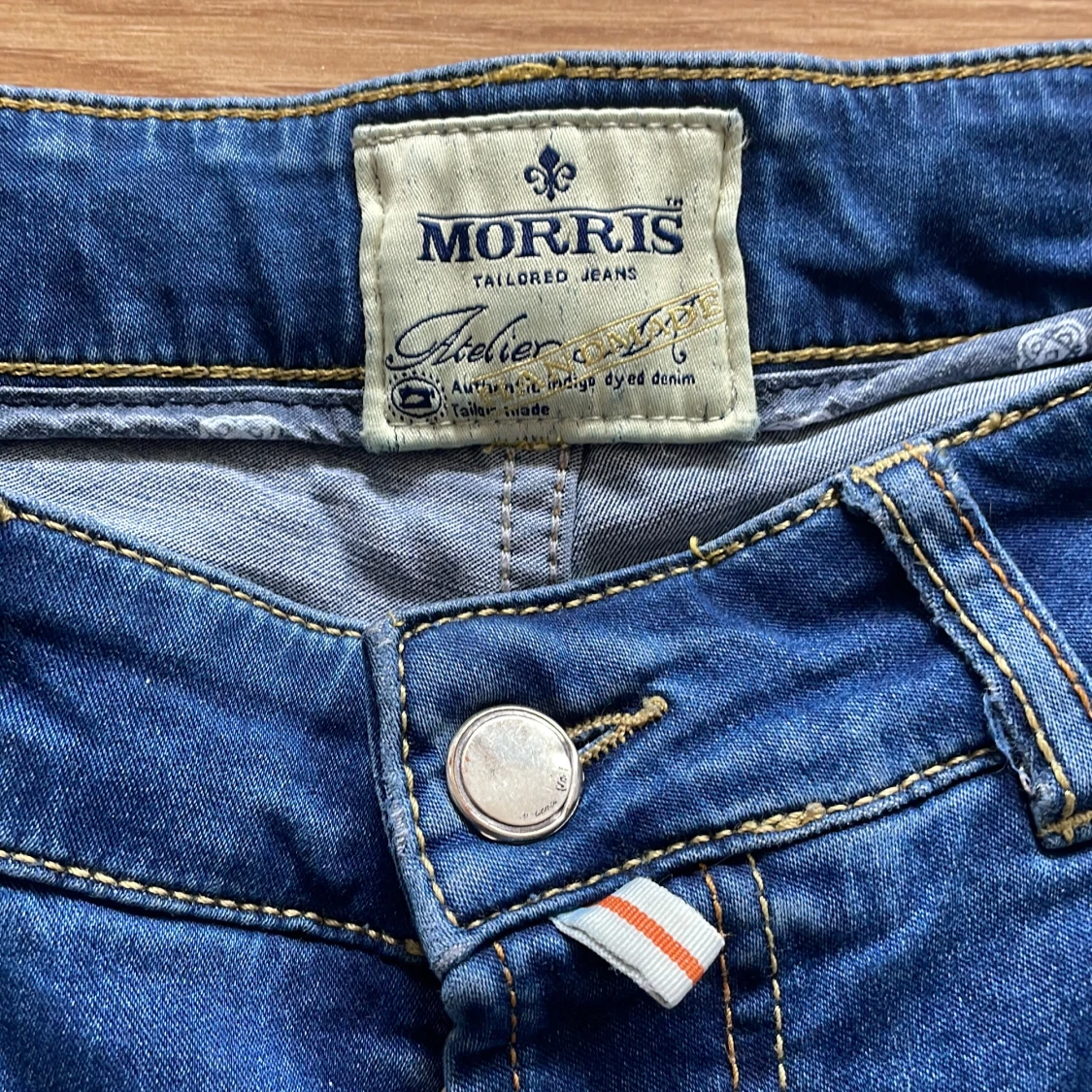 Säljer ett par klassiska blå jeans med snygga kontrastsömmar och broderad Morris logga på myntfickan. Bakfickorna har coola vågformade sömmar. Jeansen har normal passform och är tillverkade i jeansmaterial. Perfekta för dig som gillar stilrena detaljer.