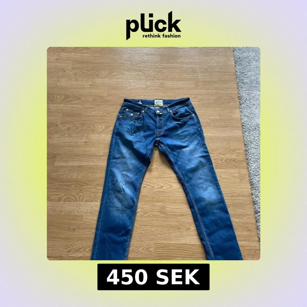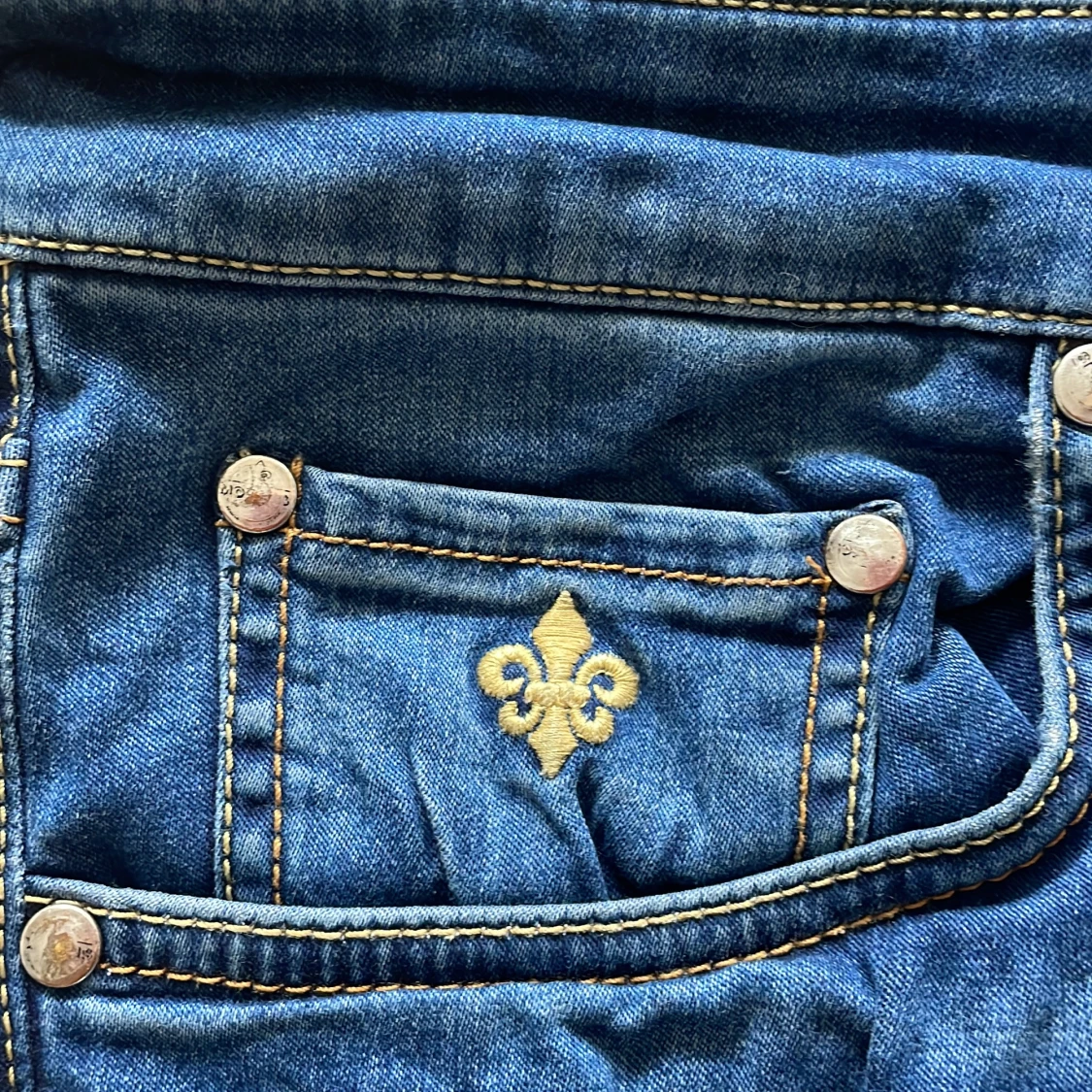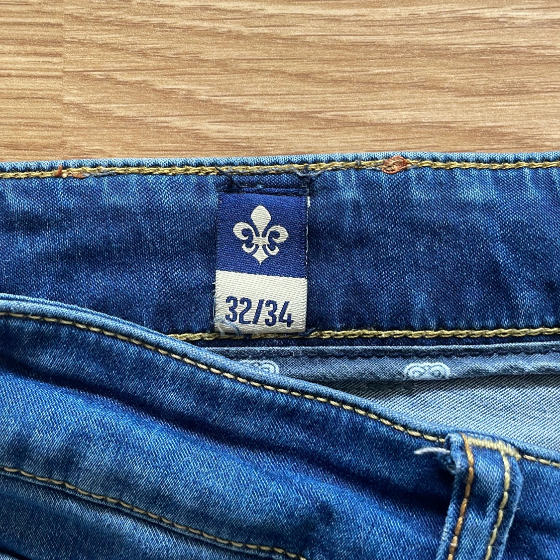 Säljer ett par klassiska blå jeans med snygga kontrastsömmar och broderad Morris logga på myntfickan. Bakfickorna har coola vågformade sömmar. Jeansen har normal passform och är tillverkade i jeansmaterial. Perfekta för dig som gillar stilrena detaljer.