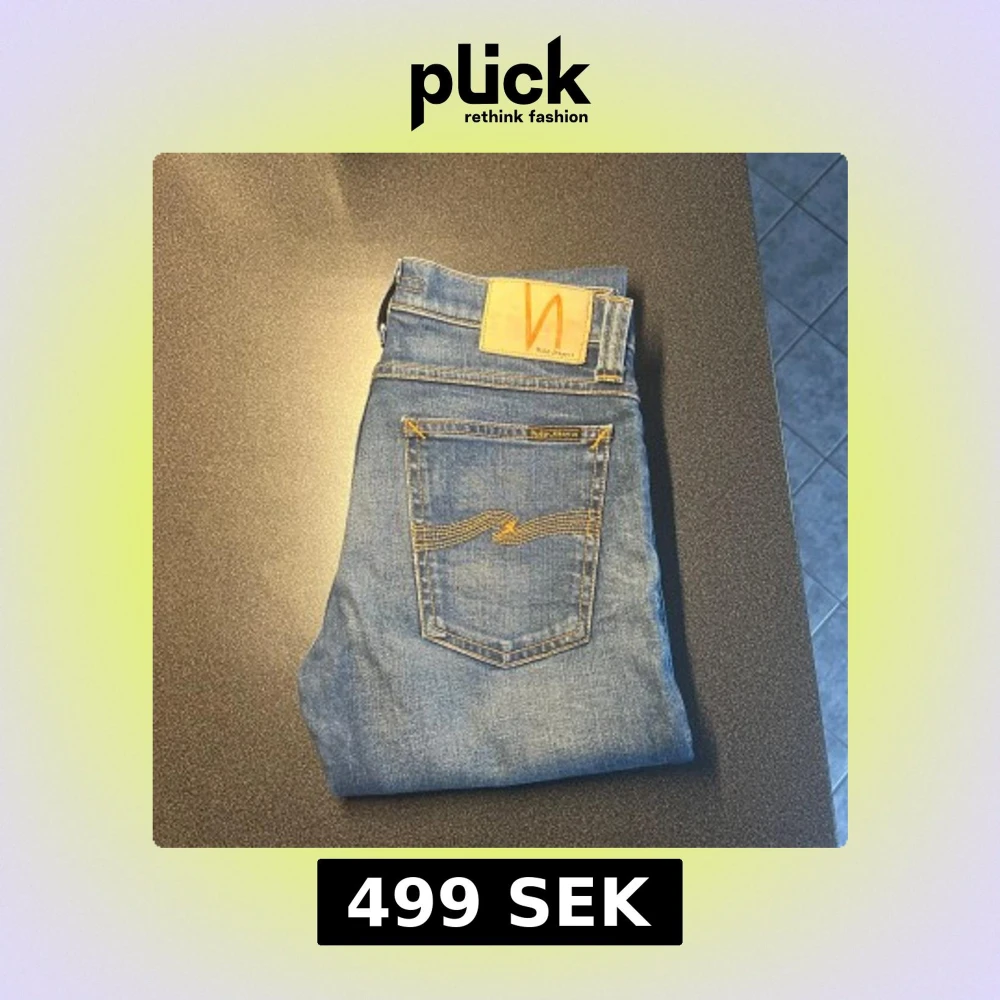 Säljer ett par klassiska blå jeans från Nudie Jeans med raka ben och snygga kontrastsömmar. Byxorna har fem fickor och Nudie-logga på bakfickan. Perfekta för dig som gillar stilrena och tidlösa jeans.