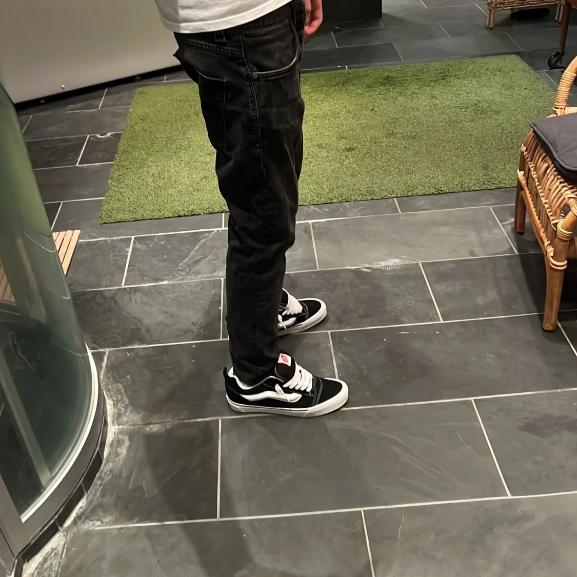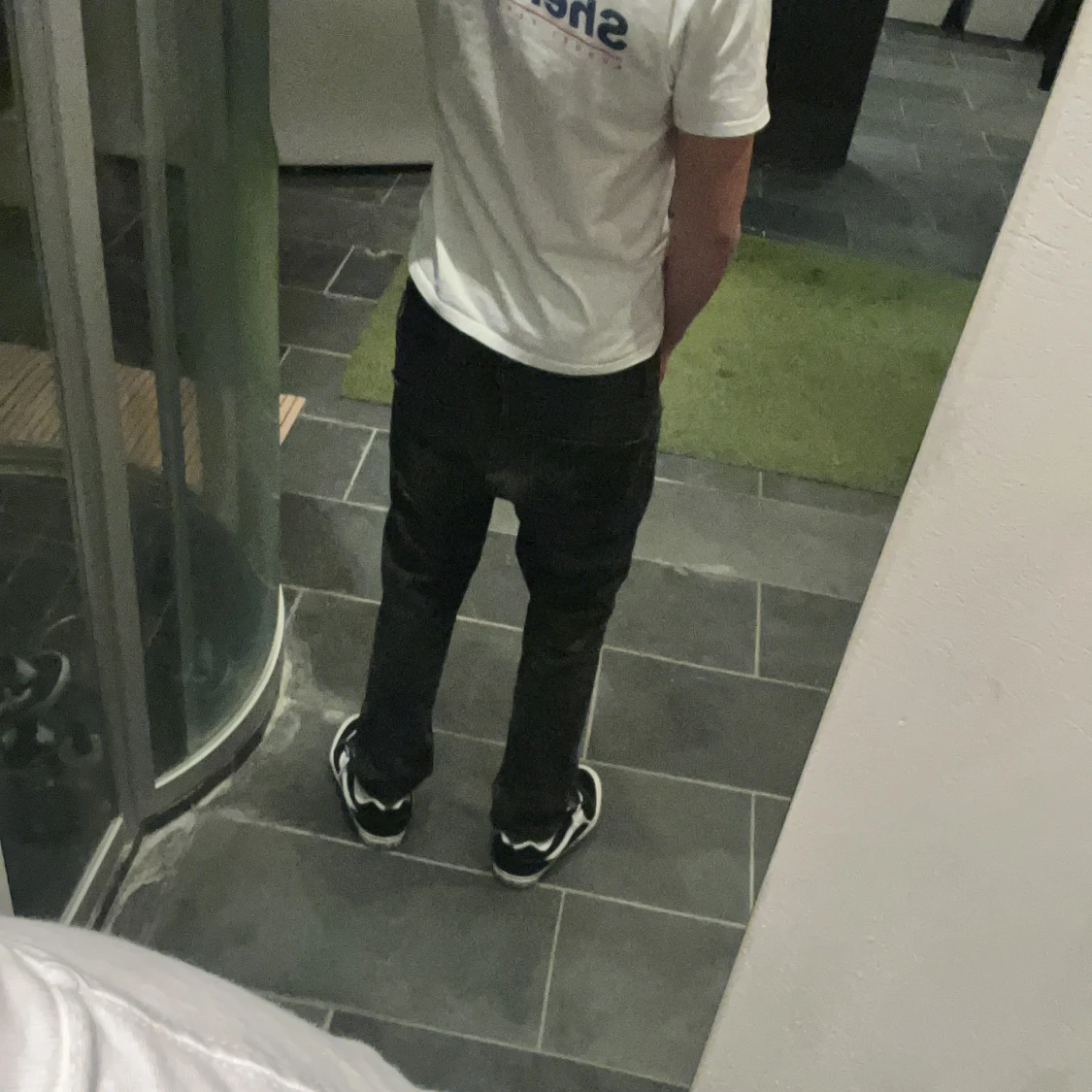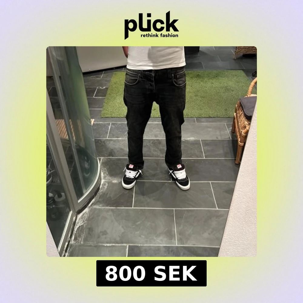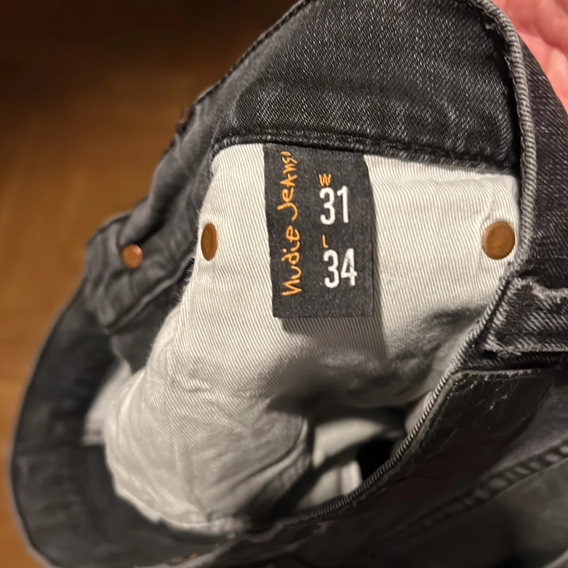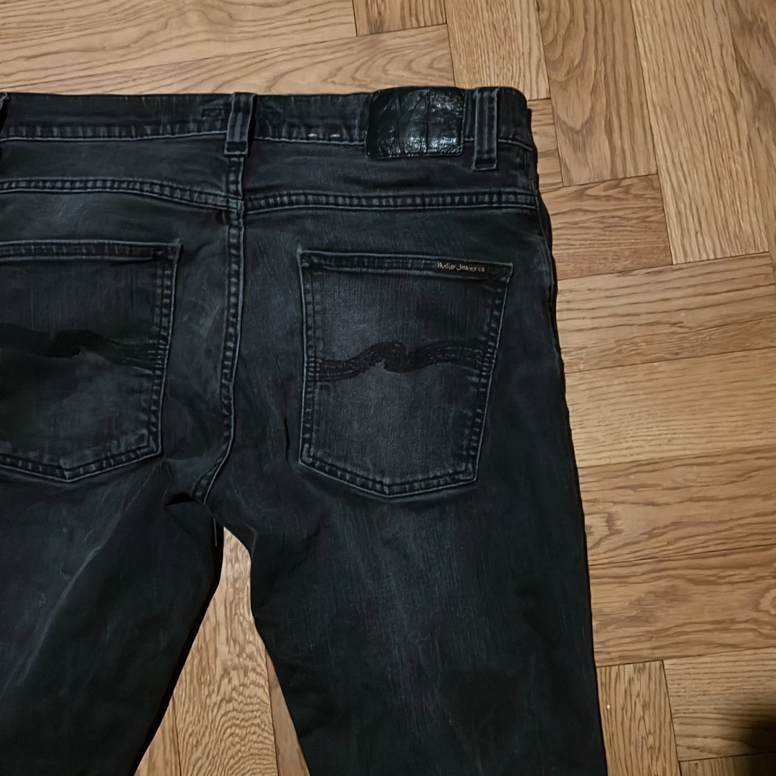 Längd = 91cm Midja = 40cm. Säljer ett par svarta jeans från Nudie Jeans med klassisk femficksdesign och diskret logga på bakfickan. Jeansen har en rak passform och är tillverkade i mjukt denimtyg. Snyggt slitna detaljer och mörk tvätt ger en cool look.