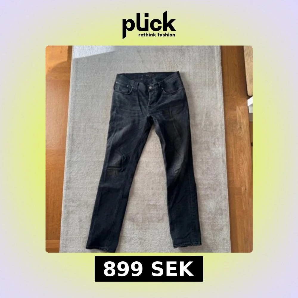 Säljer ett par svarta jeans från Nudie Jeans i storlek 33/34. Jeansen har klassisk femficksdesign, raka ben och snyggt slitna detaljer. Tillverkade i mjukt denimtyg som sitter skönt och passar till allt. Perfekta för dig som gillar stilrena svarta jeans. Inga defekter. Slim fit