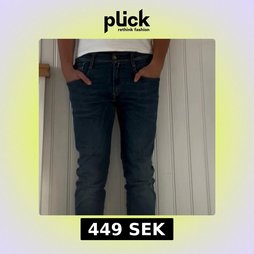 Säljer ett par blå slim fit jeans från Replay med klassisk femficksdesign och snygga detaljer på bakfickorna. Jeansen har normal midja och är tillverkade i stretchigt denim för en bekväm passform. Perfekta för dig som gillar en modern och stilren look. Storlek 31:32