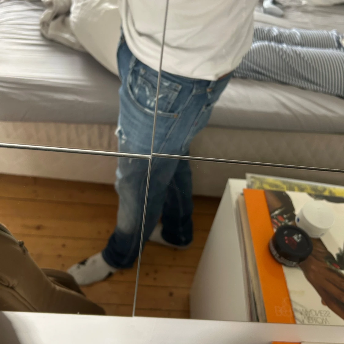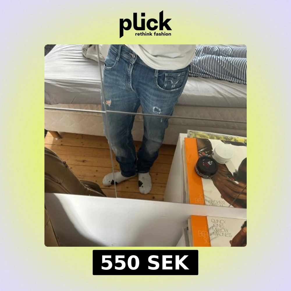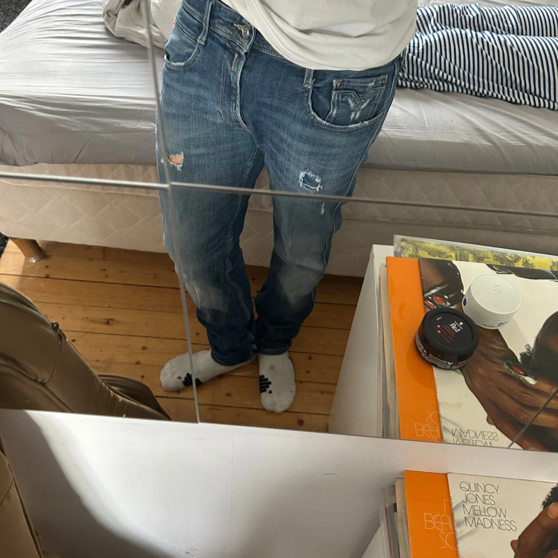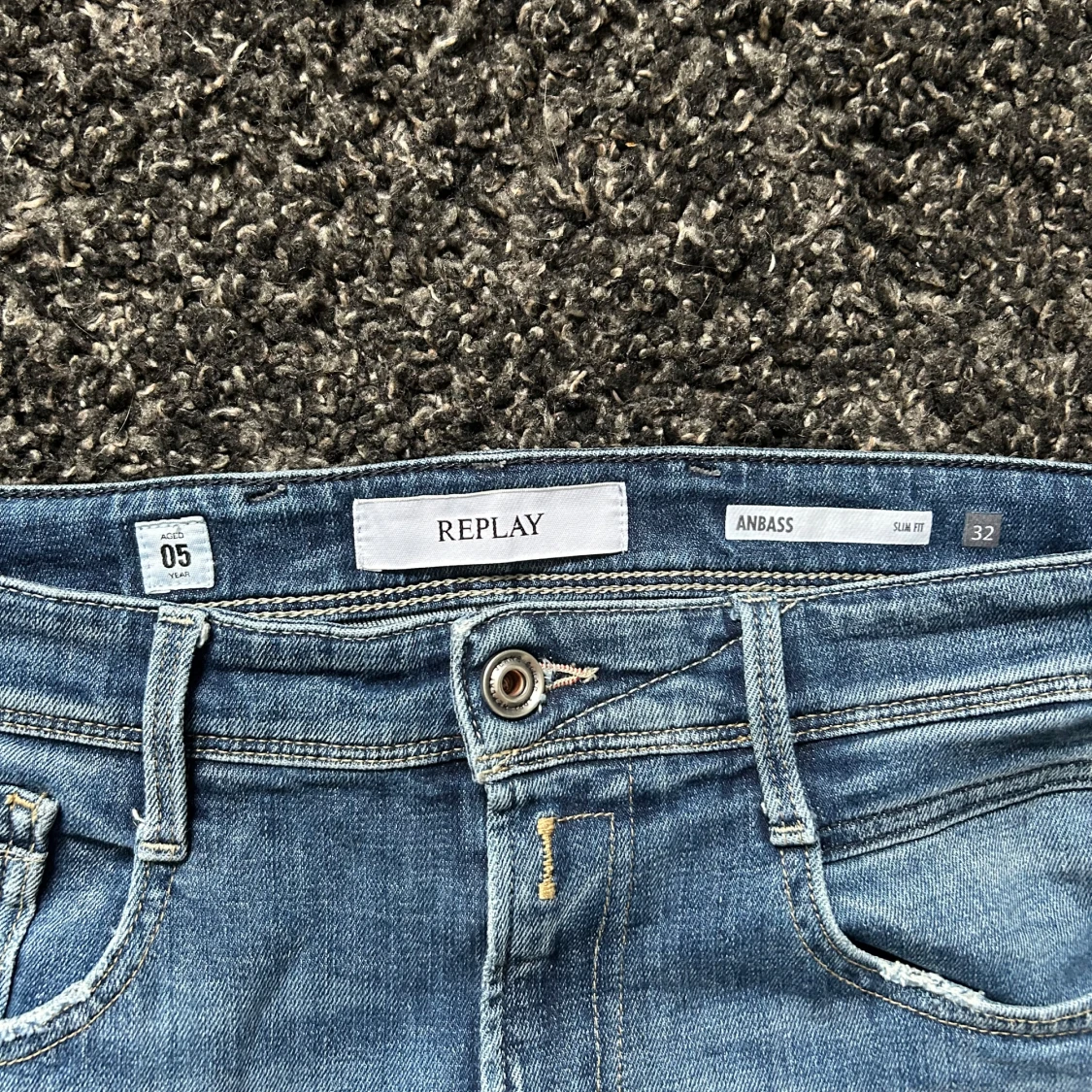 Säljer ett par Replay Anbass jeans i ljusblå tvätt med slitningar och hål på låren. Modellen är slim fit med klassisk femficksdesign och normal midja. Jeansen är i mjukt bomullsmaterial och har snygga detaljer vid fickorna.
