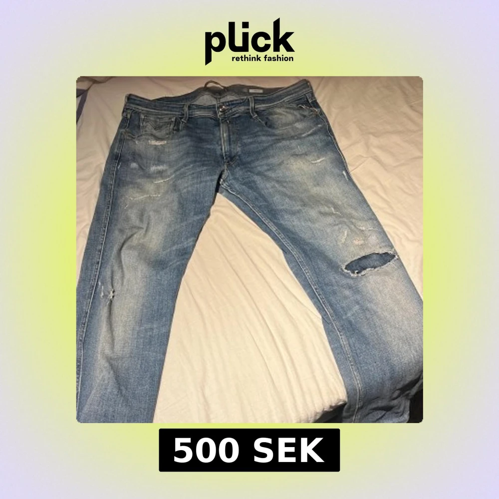 Säljer ett par Replay Anbass jeans i ljusblå tvätt med feta slitningar och hål på ena benet. Klassisk femficksmodell med snygga detaljer och läderpatch bak. Tillverkade i bomull och har en relaxed vibe. Perfekta för dig som gillar en lite mer slitiga jeans med väldigt snygga, passar perfekt med min vita stone island vindjacka som också ligger uppe på min plick😃
