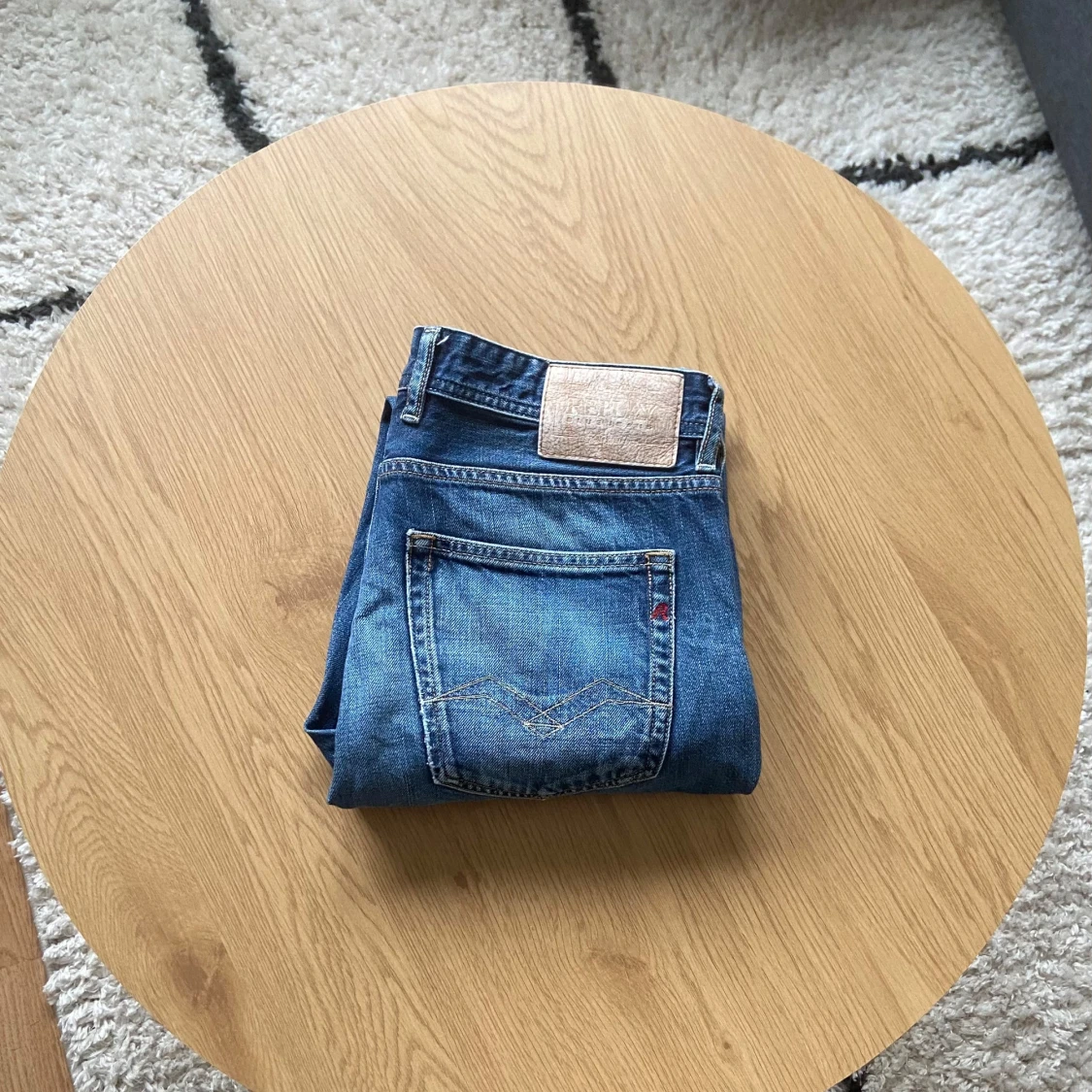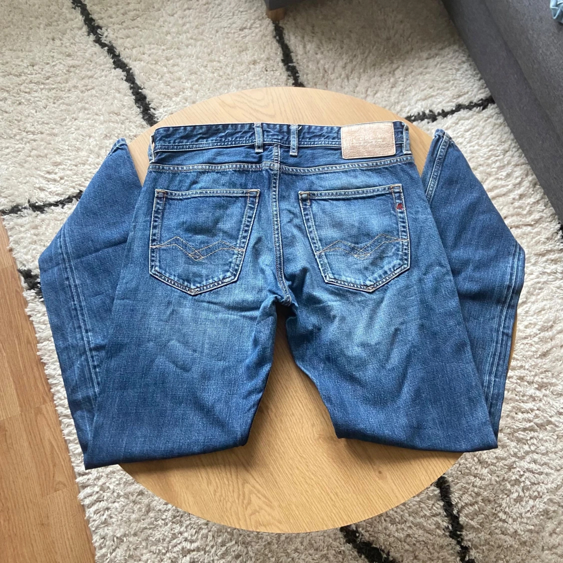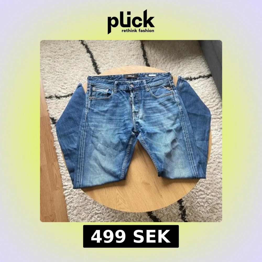 Hej👋 Säljer ett par snygga blå jeans från Replay i klassisk femficksmodell. Jeansen har raka ben, normal passform och coola slitningar framtill🙌 Materialet är robust denim med tydliga kontrastsömmar och Replay-logga på bakfickan. Perfekt för dig som gillar en tidlös streetstil💯 Byxorna är i Grover modell och har storlek W31 L32!📐 Vid frågor: Meddela oss📩