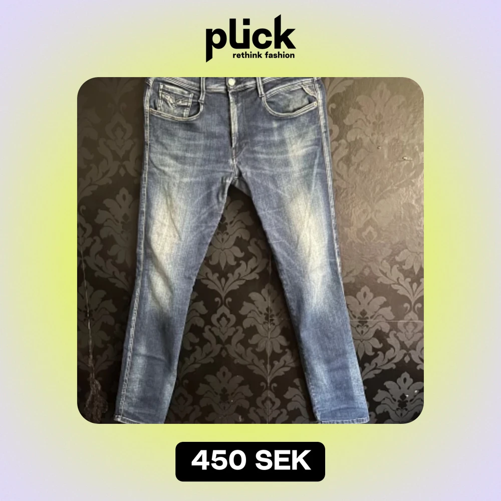 Snygga mörkblå Replay Anbass jeans med snygg wash. Storlek W33 L32, lite tightare fit. Har en lagning i grenen som är profissionellt gjord och inte syns vid användning. Pris ej hugget i sten, skriv vid frågor