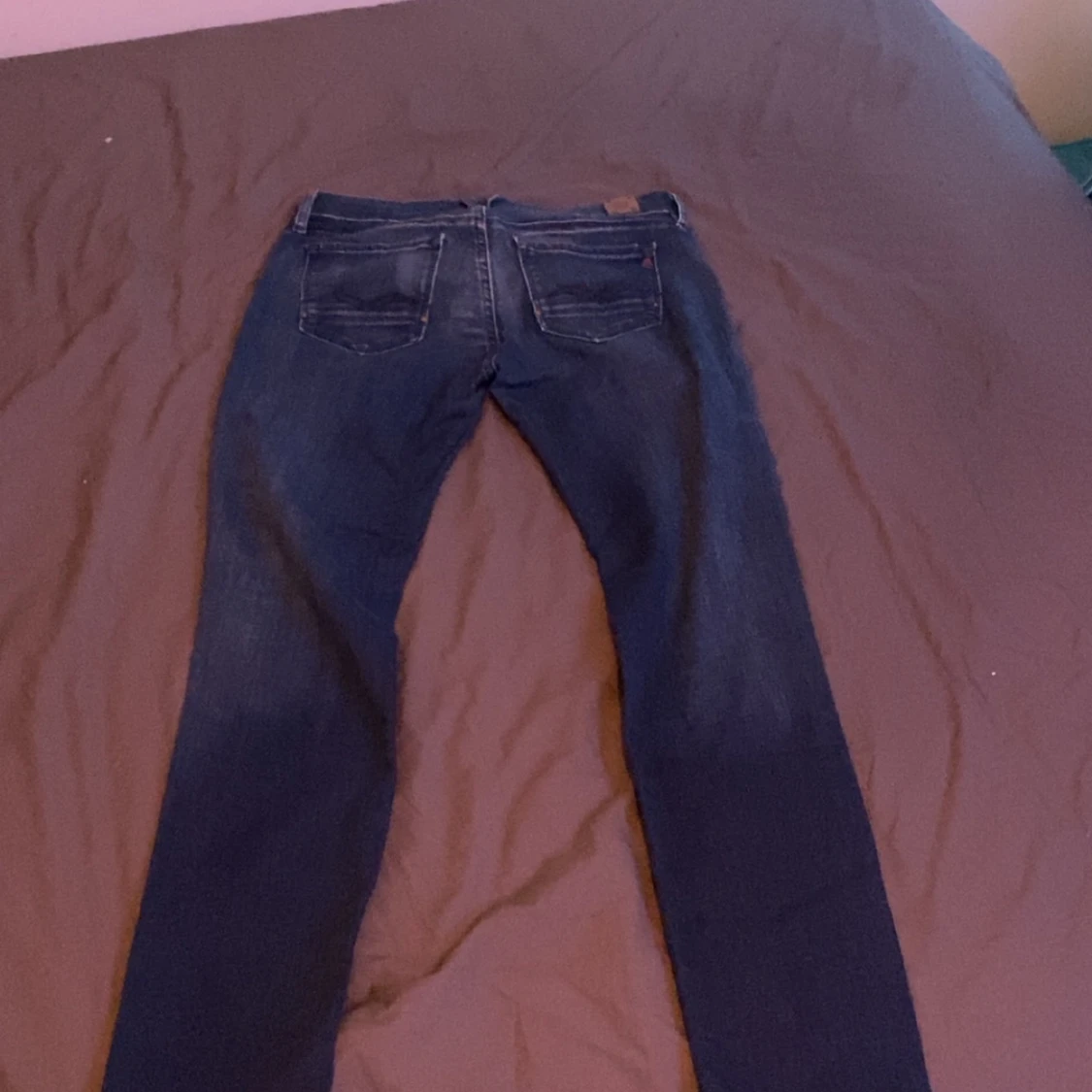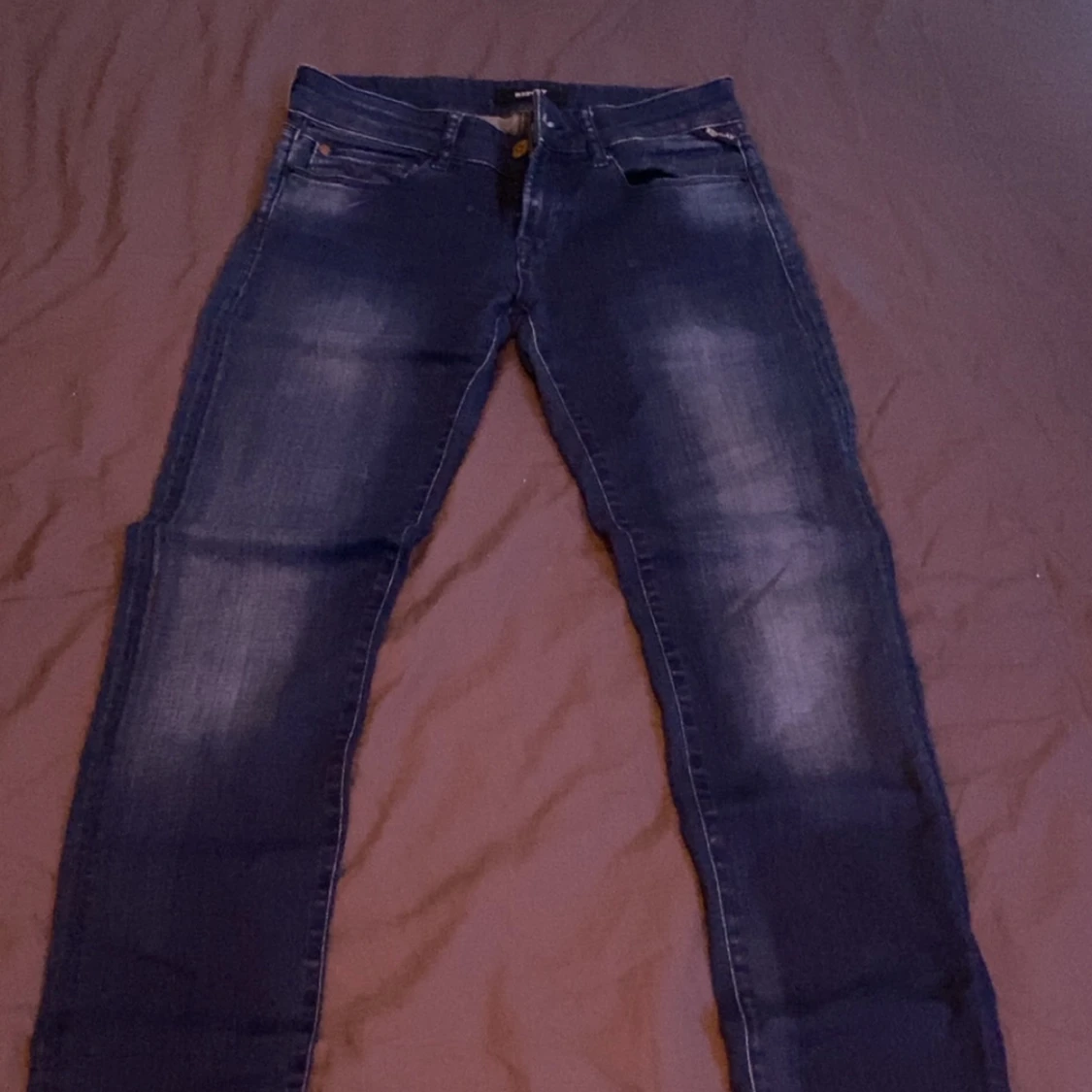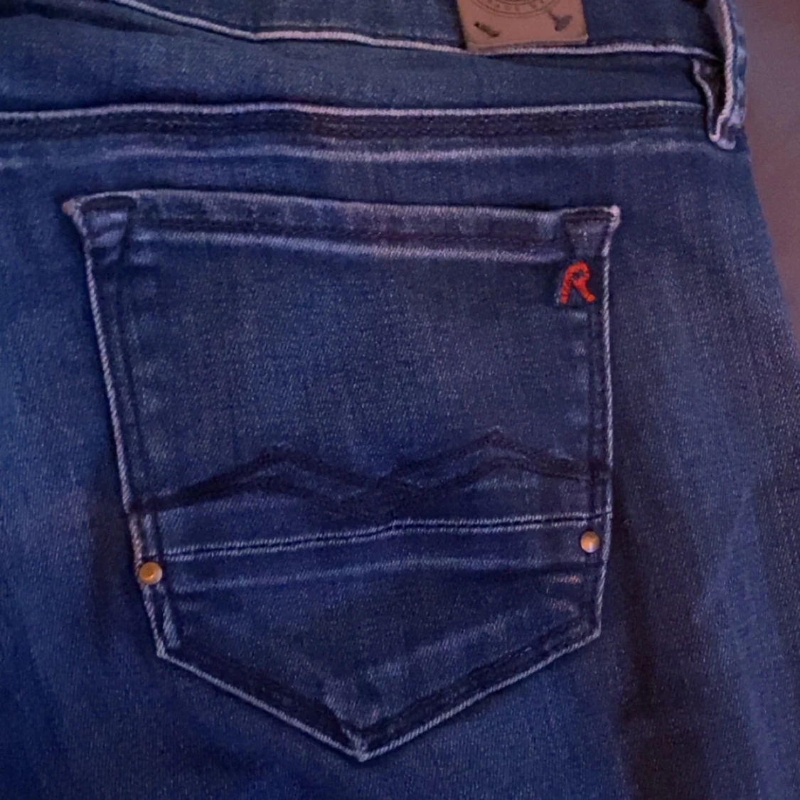Säljer ett par mörkblå skinny jeans från Replay med klassisk femficksdesign och snygga slitningar framtill. Jeansen har en liten röd R-detalj på bakfickan och är tillverkade i stretchigt denim för en tight passform. Storlek W27 L30 (kolla sista bild)