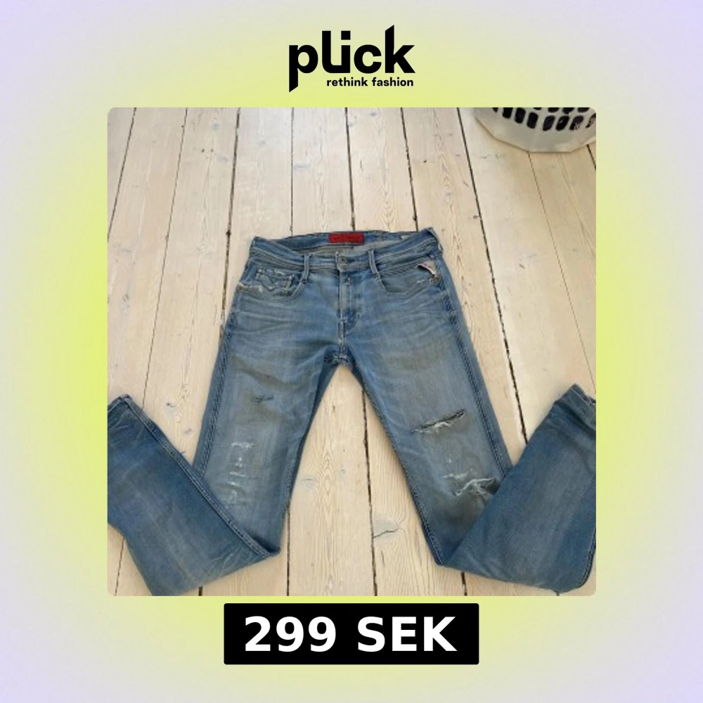 Säljer ett par Replay Anbass jeans i ljusblå tvätt med slitningar och detaljerade revor. Klassisk femficksmodell med dragkedja och knapp. Byxorna har normal passform och är i storlek W30 och L34. Pris kan diskuteras!