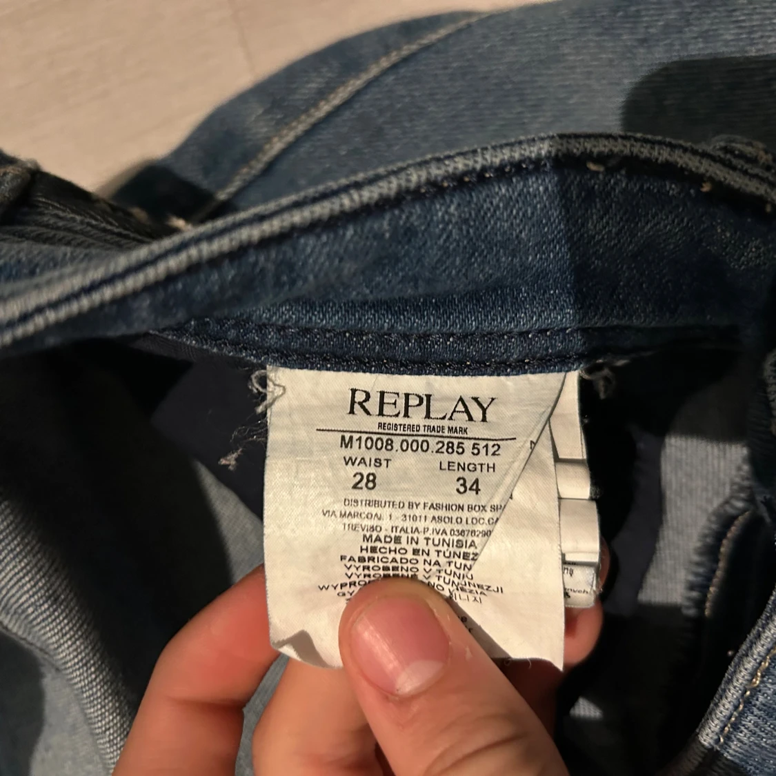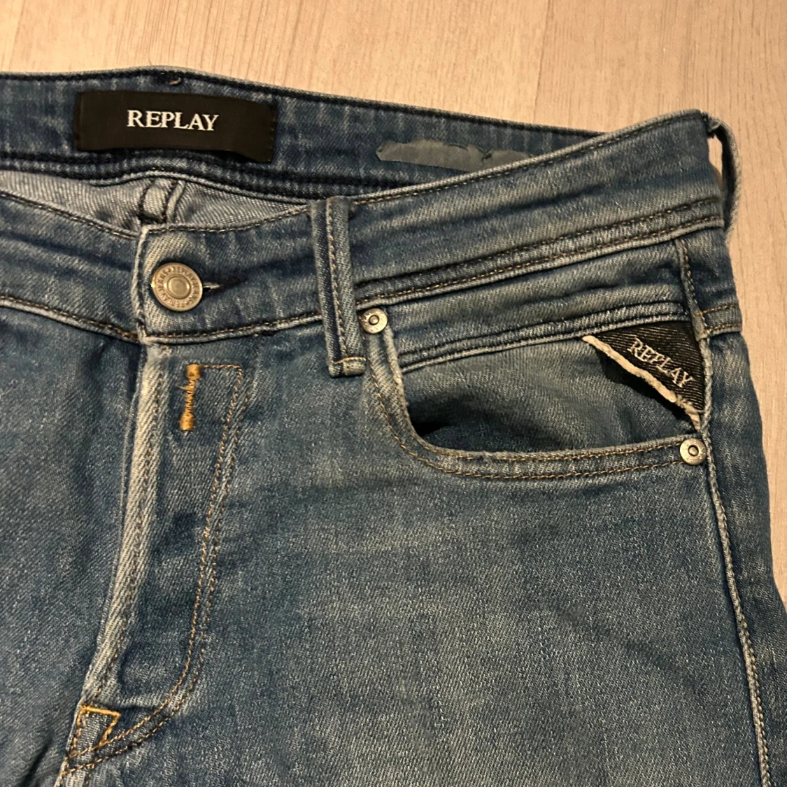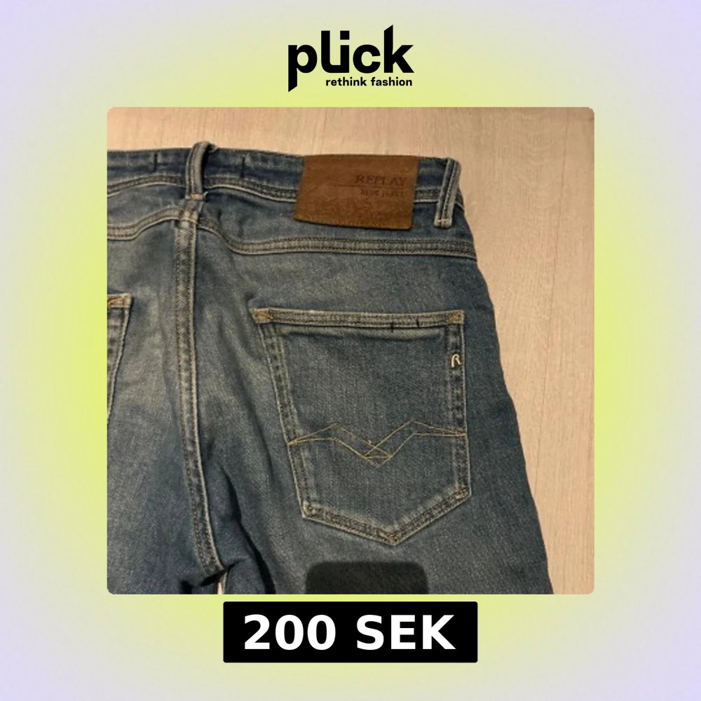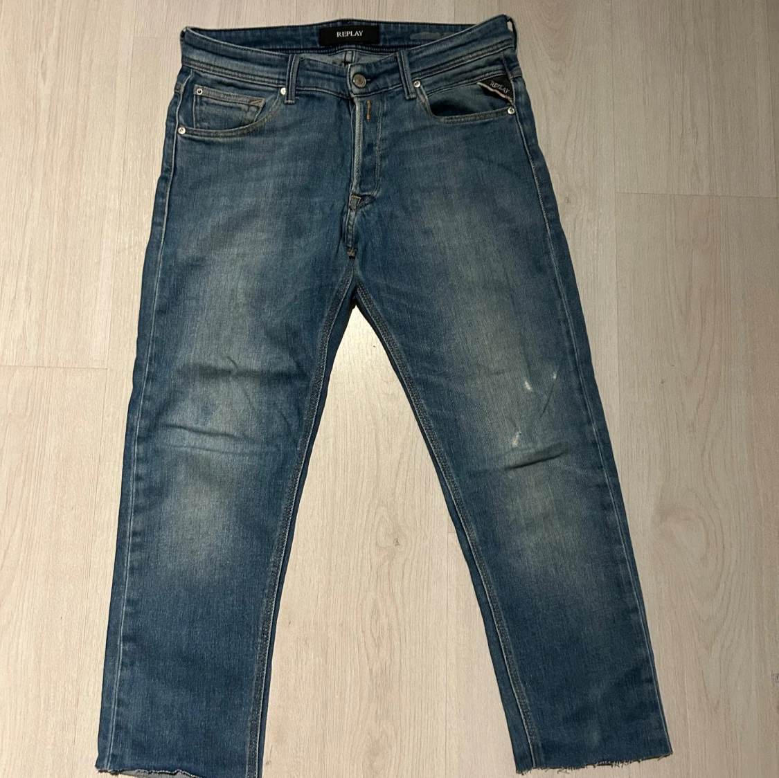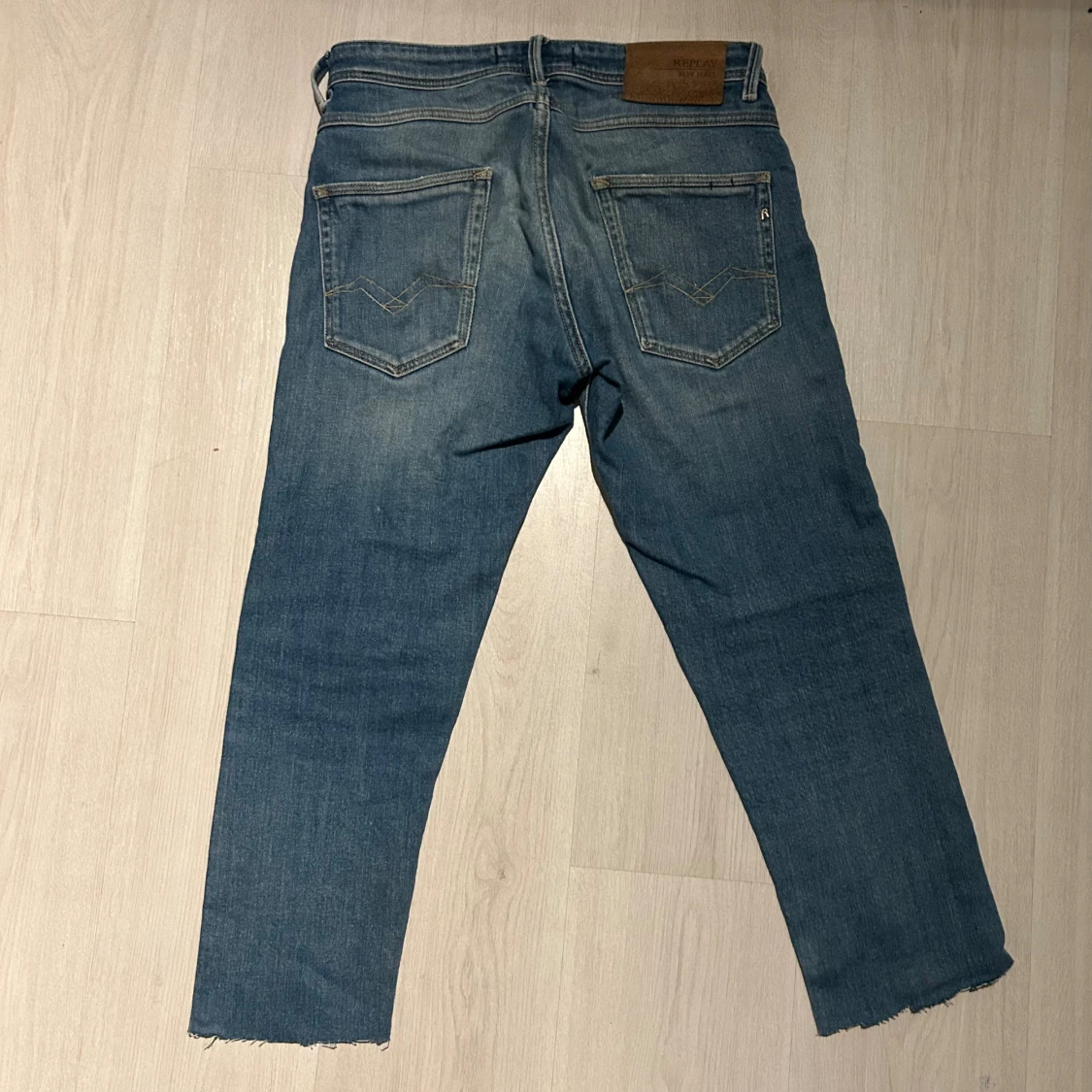 Ett par snygga replay jeans med väldigt snygg tvätt och egengjorda slitningar. Jag har klippt de men jag klippte väldigt mycket så de är ca 80 cm långa tyvärr därav de låga priset men går lätt att sy upp så de ser ut som vanligt igen! Tveka inte att höra av er om ni vill ha mått eller bilder!
