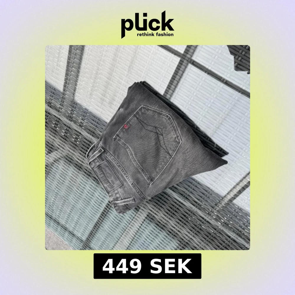 Säljer ett par svarta Replay jeans med klassisk femficksdesign och snygga detaljer på bakfickorna. Jeansen har en diskret logotyp på bakfickan och är perfekta för dig som gillar en stilren look.