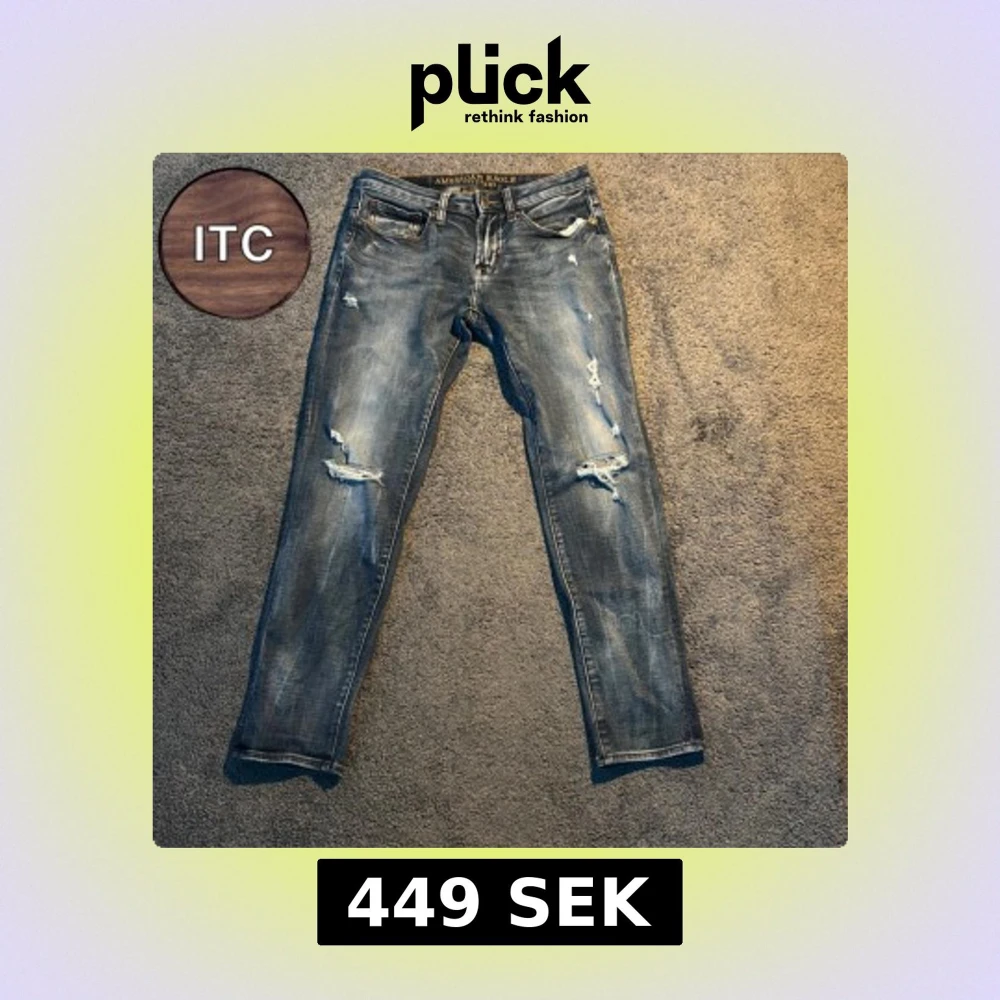 Säljer ett par blå jeans med slitningar och hål på benen. Jeansen har klassisk femficksdesign och en snygg tvättad look.