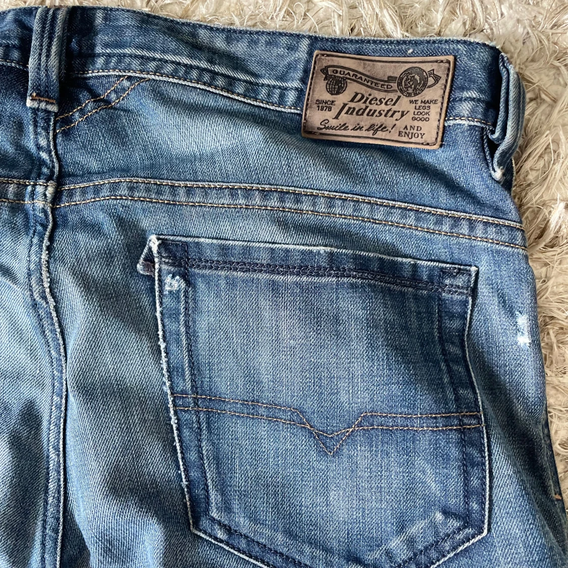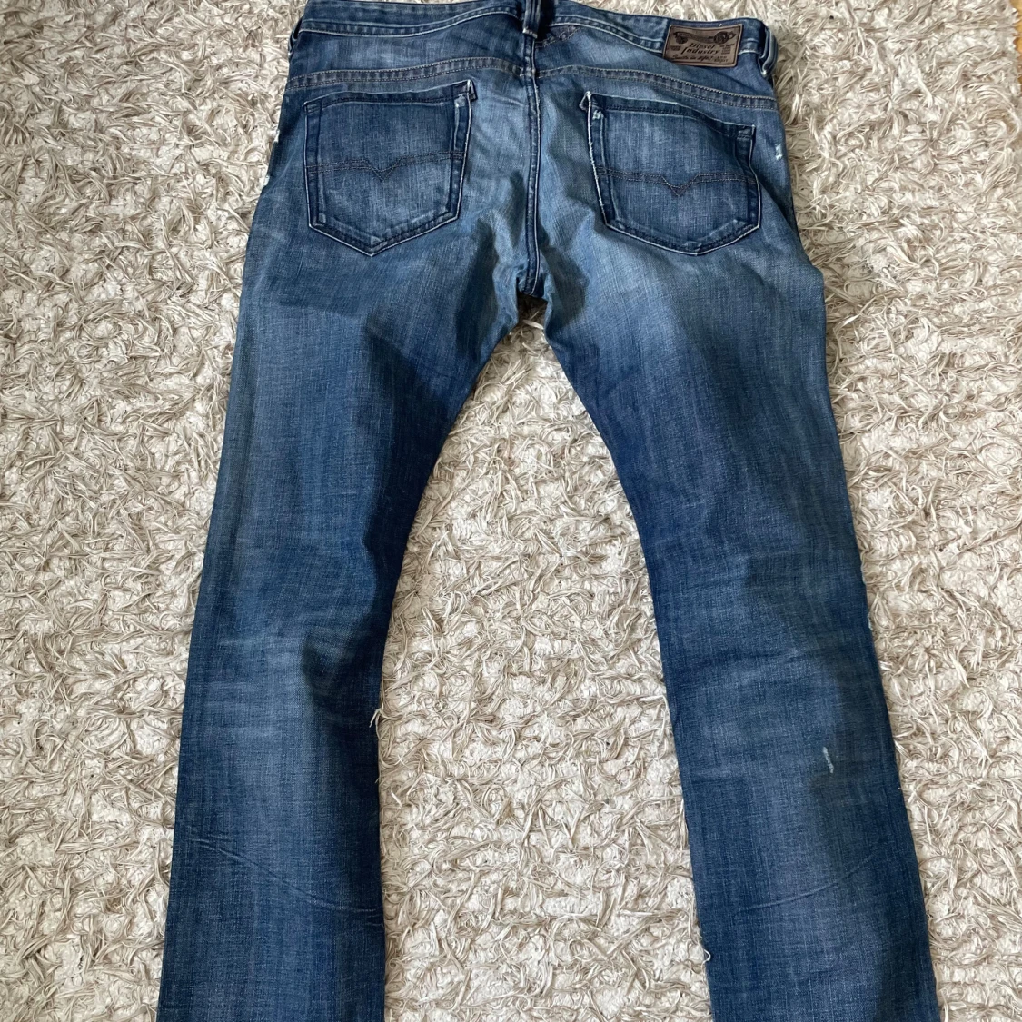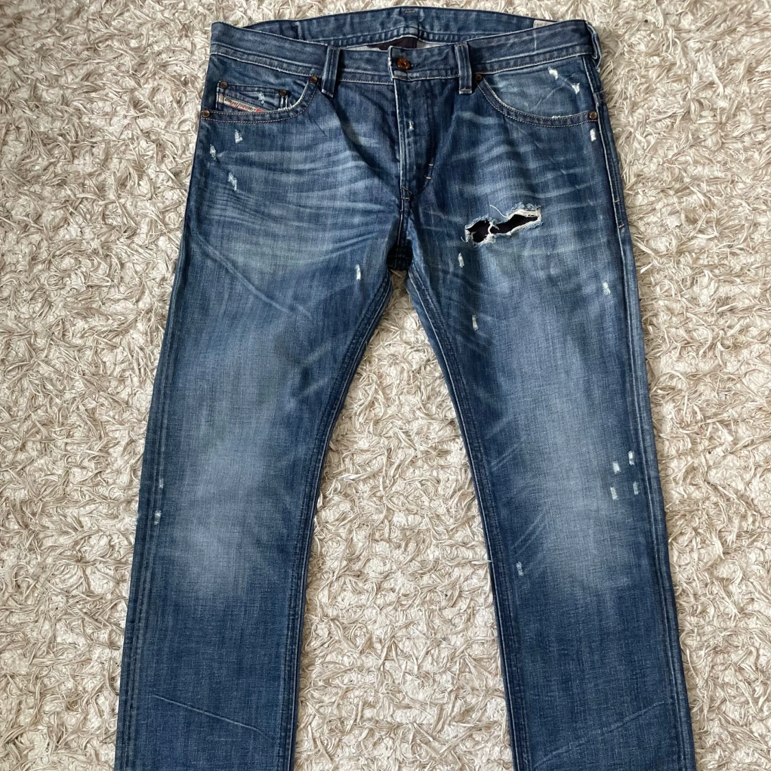 Säljer ett par blå jeans från Diesel med slitningar och hål på framsidan för en riktigt rå streetlook. Klassisk femficksmodell med snygga detaljer och tvättad finish. Perfekta för dig som gillar en avslappnad och trendig stil.