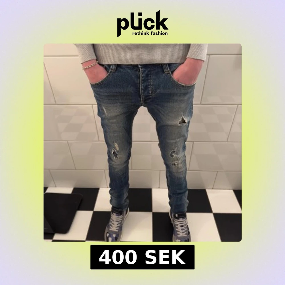 Säljer ett par Ansrkjendt jeans, riktigt snygga med slitningar. Modellen är 188cm jeansen är Perfekta för både höst och vår! Jeansen är fint ihop sydda. Fråga om bilder