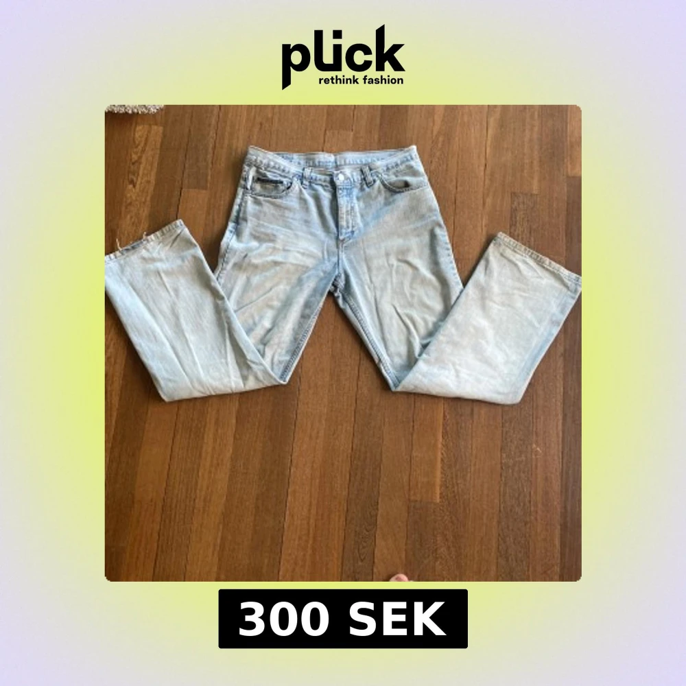 Säljer ett par Tvär Feta ljusblå jeansbyxor från Bridle med klassisk femficksdesign och raka ben. Jeansen har normal passform och är tillverkade i denim med subtila slitningar för en avslappnad look. Perfekta för dig som gillar en tidlös stil.