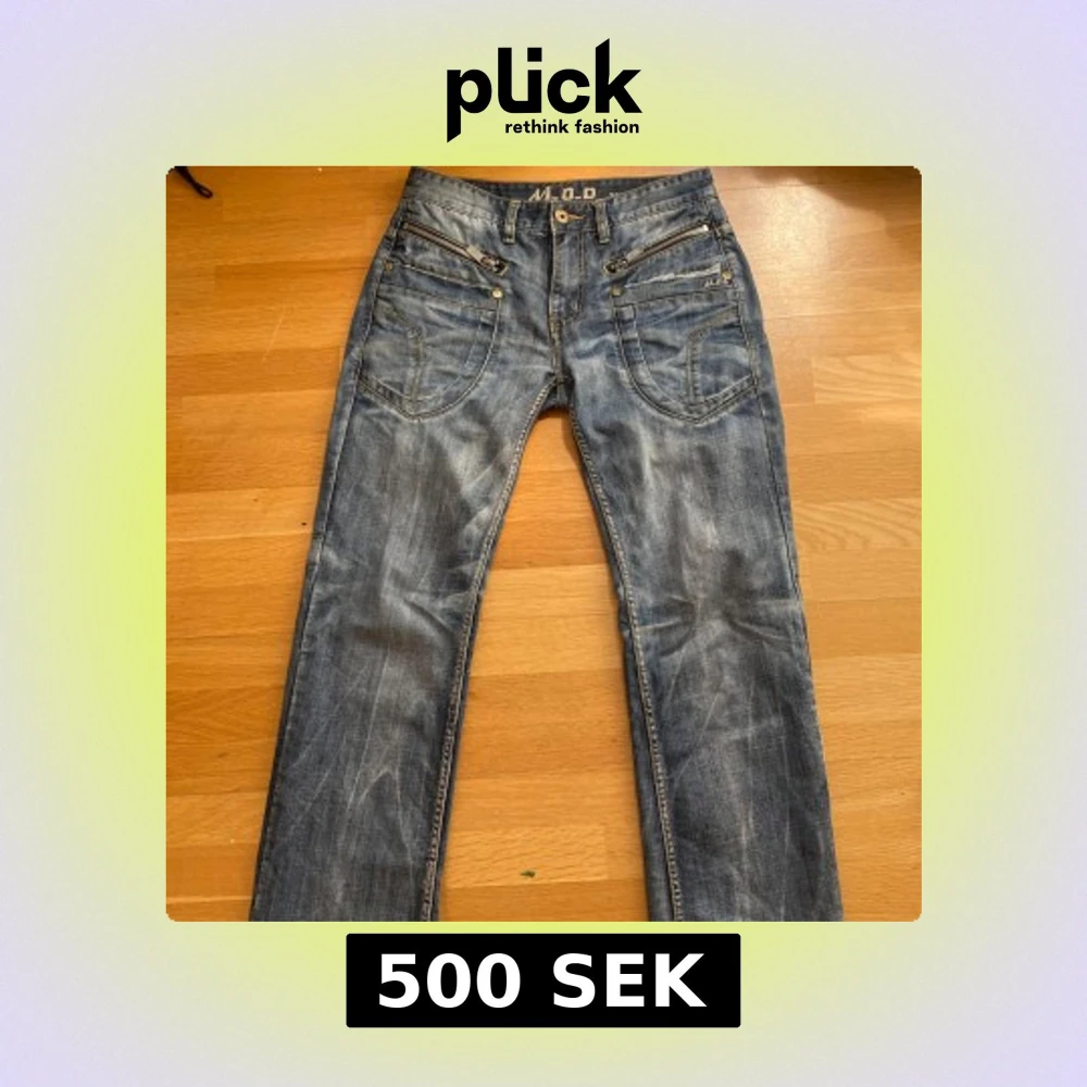 Snygga blå jeans från M.O.D med en klassisk femficksdesign och slitna detaljer. De har en lite baggy passform och är utsvängda där nere. Jeansen har en knappgylf och är tillverkade i ett robust denimtyg. Midjemåttet är 88.